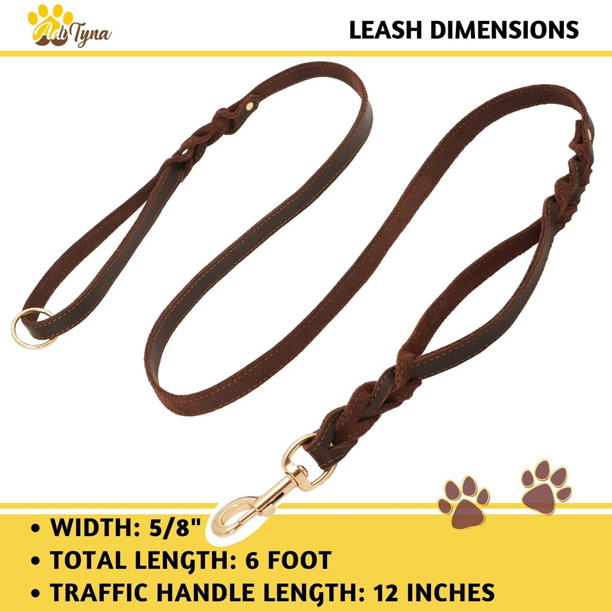 Adityna Double Handle Leather Dog Leash 6Ft - Heavy Duty Braided Leash With Traffic Handle - Lead For Training And Walking Medium & Small Dogs
