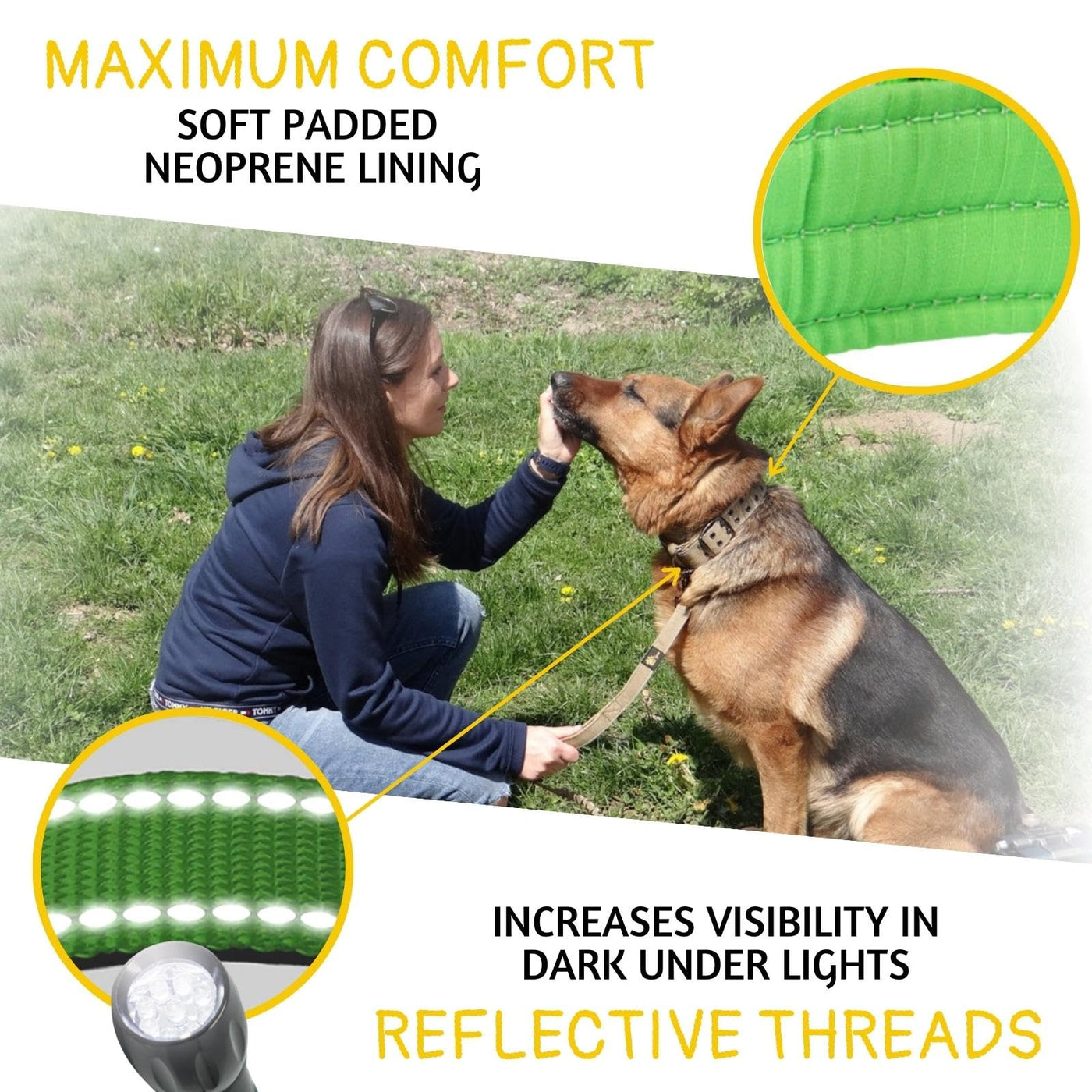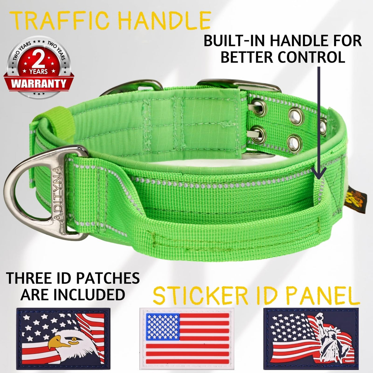 Experience The Perfect Blend Of Style, Comfort, And Durability With Our Adjustable Medium Dog Collar, Tailored For The Active And Beloved Medium-Sized Breeds In Your Life. This Versatile Collar Is Meticulously Designed To Adjust From 15 To 19 Inches, Ensuring A Perfect Fit For A Wide Range Of Breeds Including Beagles, Corgis, Dachshunds, Australian Shepherds, Basset Hounds, Poodles, Greyhounds, Bichon Frises, And Border Collies. It'S Essential To Measure Your Dog'S Neck For The Right Size, Ensuring Maximum Comfort And Safety. Our Collar Stands Out With Its Improved Comfort And Safety Features. Boasting A Wider 1.5-Inch Width, This Heavy-Duty Collar Is Crafted From Lightweight Nylon Webbing. It'S Not Just About Strength; We Prioritize Your Dog'S Comfort, Ensuring Flexibility For All Activities Like Running, Walking, And Active Play. The Heavy-Duty D-Ring For Leashes Adds An Extra Layer Of Reliability, Making Your Outdoor Adventures Worry-Free. Control Is Paramount, Especially In Training And High-Traffic Areas. Our Strong, Comfortable Control Handle Is A Game-Changer. Whether You'Re Training, Patrolling, Hunting, Or Simply Managing Your Dog Amidst Distractions, The Easy-Grab Handle On Our Collar Enhances Manageability, Providing A Secure Grip For Immediate Control. Safety Is A Non-Negotiable Aspect Of Our Design. Our Reflective Safety Stitching Is Thoughtfully Integrated For Outdoor Use. The Durable, Weather-Resistant Collar Features Reflective Stitching Along Its Nylon Webbing, Making Your Dog Visible And Safe During Night Walks. This Tactical Design Element Ensures Peace Of Mind During Your Evening Strolls. Above All, We Understand The Need For Comfort. Our Neoprene-Padded Dog Collar Is Lined With Soft Neoprene, Offering Supreme Comfort And Preventing Chafing. This Feature Is Particularly Beneficial For Dogs With Sensitive Skin, Ensuring A Snug, Cozy Fit. It'S More Than Just A Collar; It'S A Statement Of Your Care And Love For Your Furry Companion.