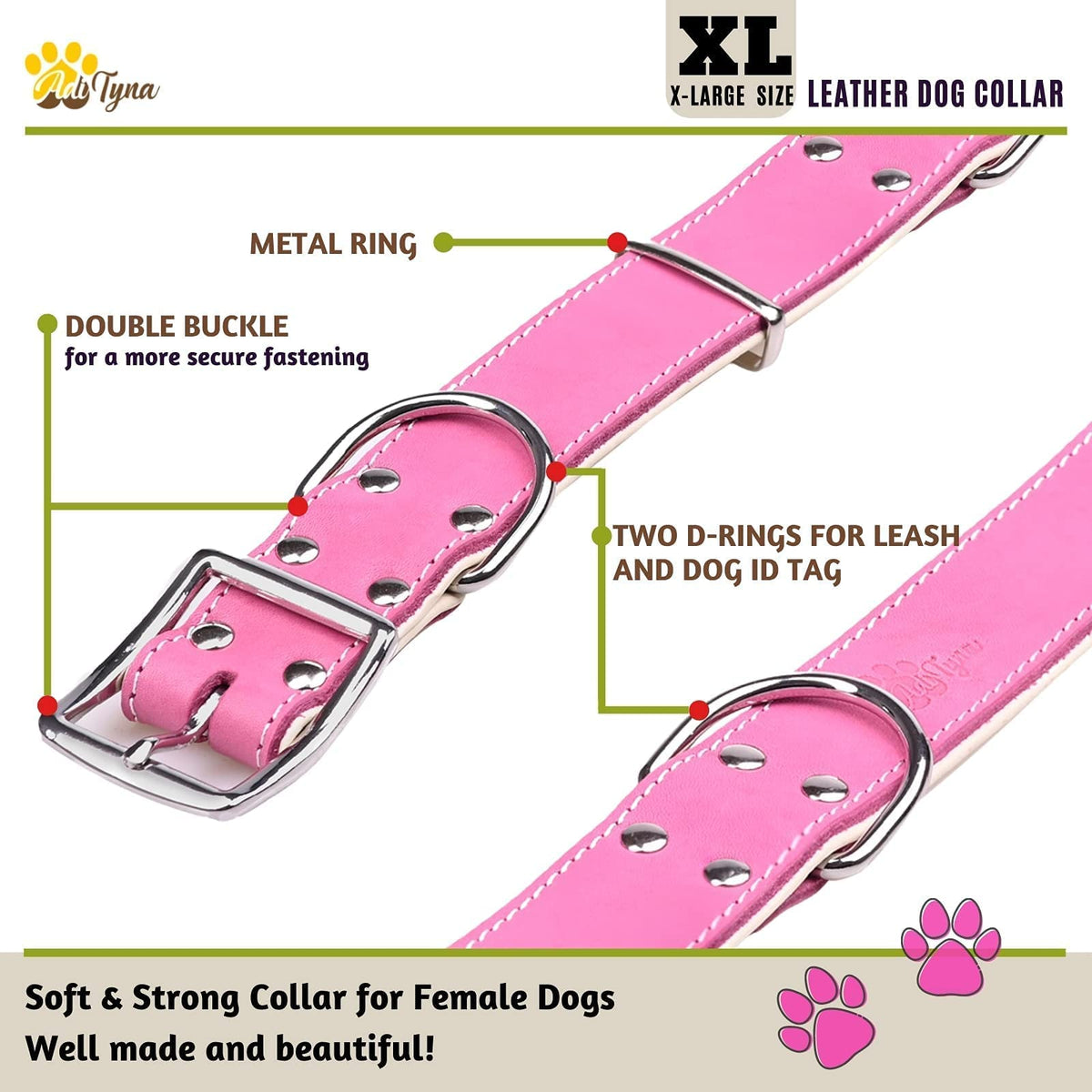 Adityna Heavy Duty Real Leather Dog Collar For Extra Large Dogs - Pink Xl Collar - Soft And Strong Thick Dog Collar With Double Metal Buckle