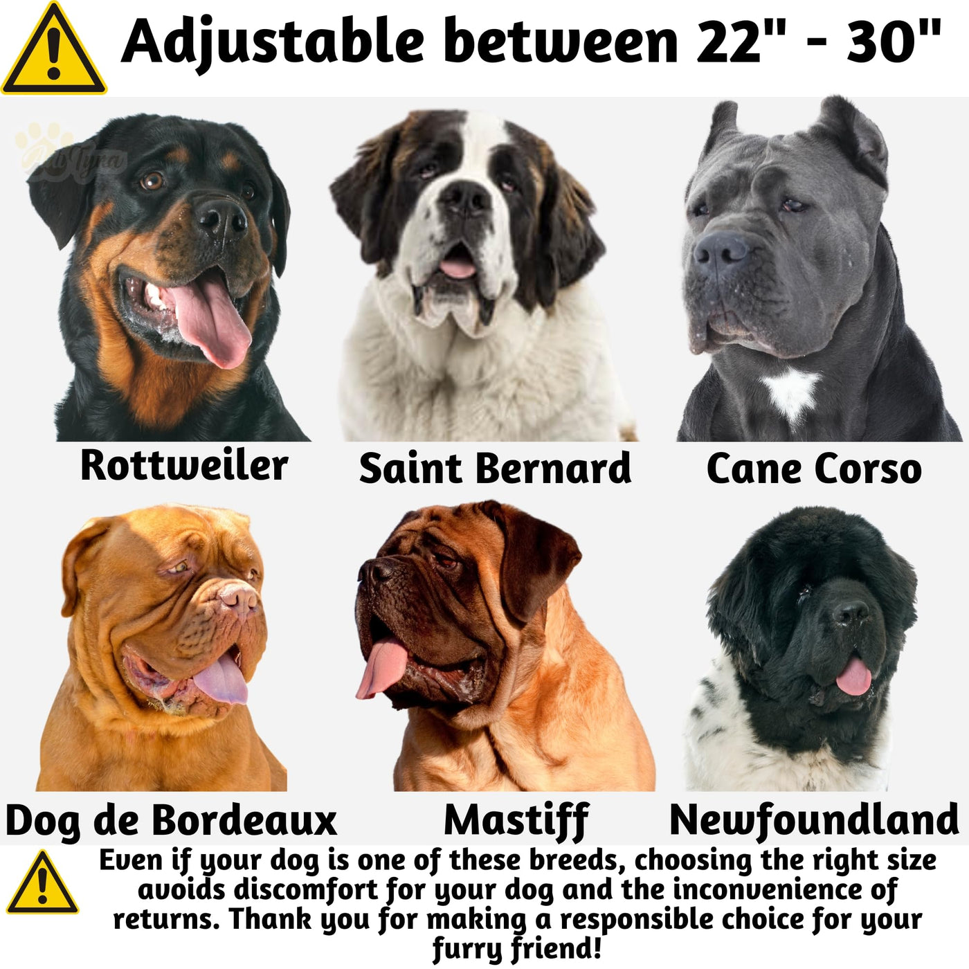 Q: What sizes does the ADITYNA Heavy Duty Real Leather Dog Collar come in?A: The ADITYNA collar is specifically designed for extra-large dogs with a neck size range of 22 to 30 inches. It features a width of 1.5 inches and a total length of 32 inches, making it ideal for breeds like Great Danes, Rottweilers, and Saint Bernards.