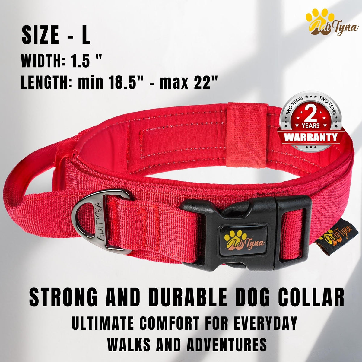 Are You Tired Of Old-Fashioned Large Dog Collars? Are You Looking For A Stylish Tactical Collar For Dogs That Features A Comfortable Traffic Handle For Better Control When Crossing The Street, In High-Traffic Events, At Vet Visits, And Can Be Successfully Used Also With A Dog Leash? Here, At Adityna Weve Built This Heavy-Duty Dog Collar For Large Dogs Made Out Of 1000D Nylon With A Soft Padded Lining As One Of The Most Comfortable K9 Collars On The Market. Maybe You Are Wondering Why You Would Choose A Tactical Collar Among The Plenty Of Others On The Market. Well, We Are Proud To Say That We Are More Than A Manufacturer. We Are A Family Company Where Quality And Love For Dogs Are The Core Fundamentals. As Pet Owners, We Know How Important A Four-Legged Family Member So We Decided To Offer You A Special Bundle. We Add Along With Our Tactical Dog Collar For Large Dogs, 3 Pack Id Patches 2.3 X 1.2 Inches. More Than That Our Adityna Adjustable Dog Collar Has A Dedicated Sticker Id Panel Area - For Id Patches, Just Because We Know How Important Is To Keep Your Best Friend Safe And Easy To Identify. We'Ve Designed This Nylon Dog Collar Available For Almost Any Dog Size. Before Ordering Ensure You Receive The Best-Fitted Size For Your Dog. Please Measure Your Dogs Neck Before Choosing The Size And Then Check The Sizing Table. Dimensions Available: M - 1.5'' X 15.5'' - 19 L - 1.5'' X 18.5'' - 22 Xl - 1.5'' X 21'' - 25'' Width: 1.5 '' Colors: Coyote Brown, Ranger Green, Black, Camo, Pink, Red, Yellow, Purple, Green, Orange, Gray, And Burgundy