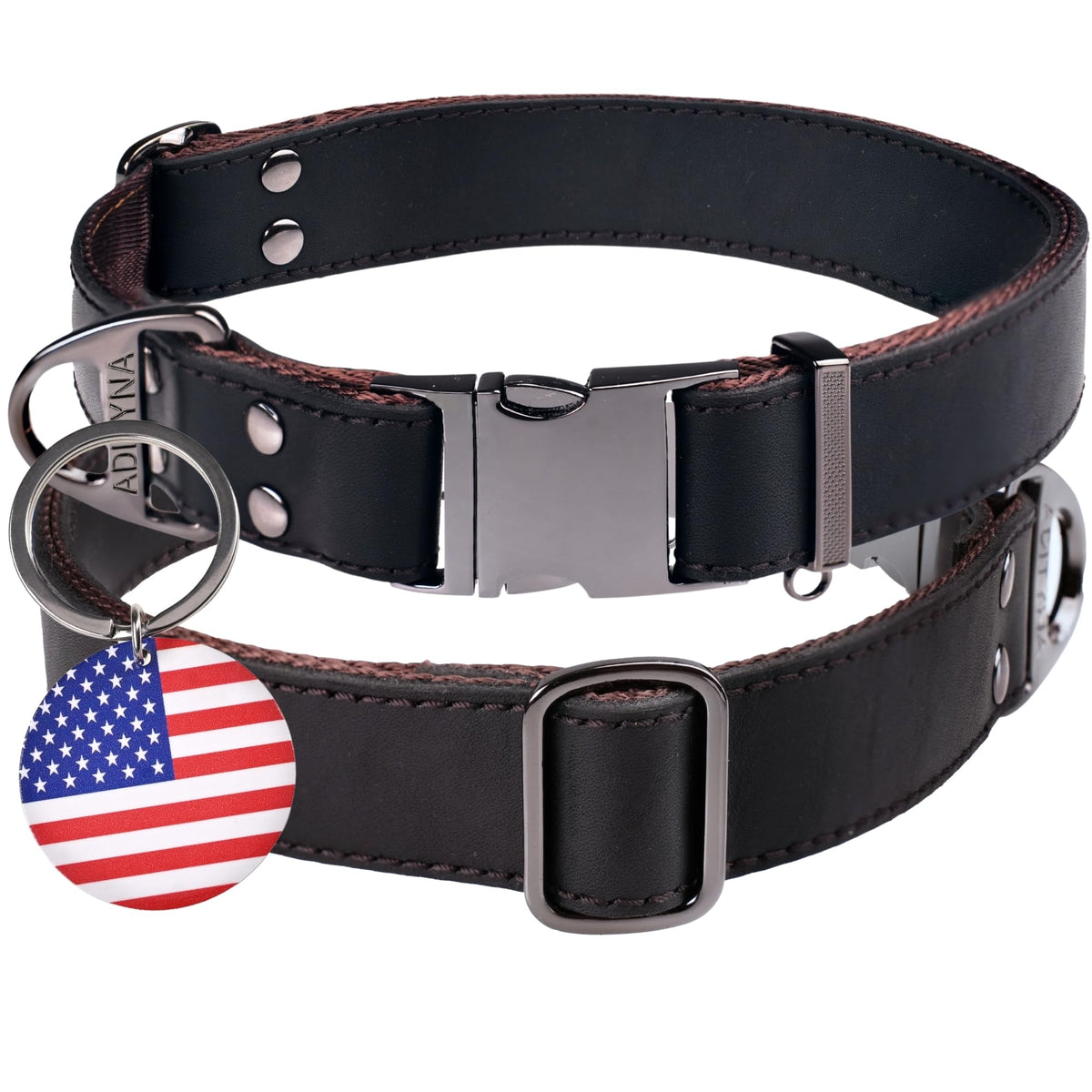 Welcome to a world where style meets functionality in tactical dog collars. Our Best Choice XL Dog Collar is meticulously designed for large and extra-large breeds, fitting neck sizes from 19 to 30 inches. With a width of 1 inches, it's ideal for Rottweilers, Cane Corso, Mastiffs, German Shepherds, Golden Retrievers, and more. To guarantee the best fit, we recommend measuring your dog's neck before referring to our sizing table. Crafted from premium quality leather, this top-rated collar is not just an accessory, but a testament to your love for your four-legged warrior. The adjustable design, featuring a sturdy metal buckle, a slide ring for dog tags, and a steel D-ring, offers both elegance and ease during your walks. Handmade with precision and care, this collar stands out with its stylish design. Made with the finest 100% genuine leather, its perfect for those seeking a collar that complements the most fashionable leather dog leashes. The deluxe gift package, complete with an engraved Dog Tag featuring the USA Flag, adds a patriotic touch to this exquisite product. Your peace of mind is our priority. This collar is built to provide a stress-free experience, boasting a strong locking system and an ultra-resistant design that withstands up to a 400lb pulling test. Walk your dog with confidence, knowing that you have chosen a collar designed for strength and durability. Embrace the blend of luxury and robustness with our leather dog collar. It's more than just a collar; its a pledge of safety, comfort, and style for your beloved large or extra-large dog. Choose our collar and join the ranks of satisfied dog owners who trust us for the best in quality and style.