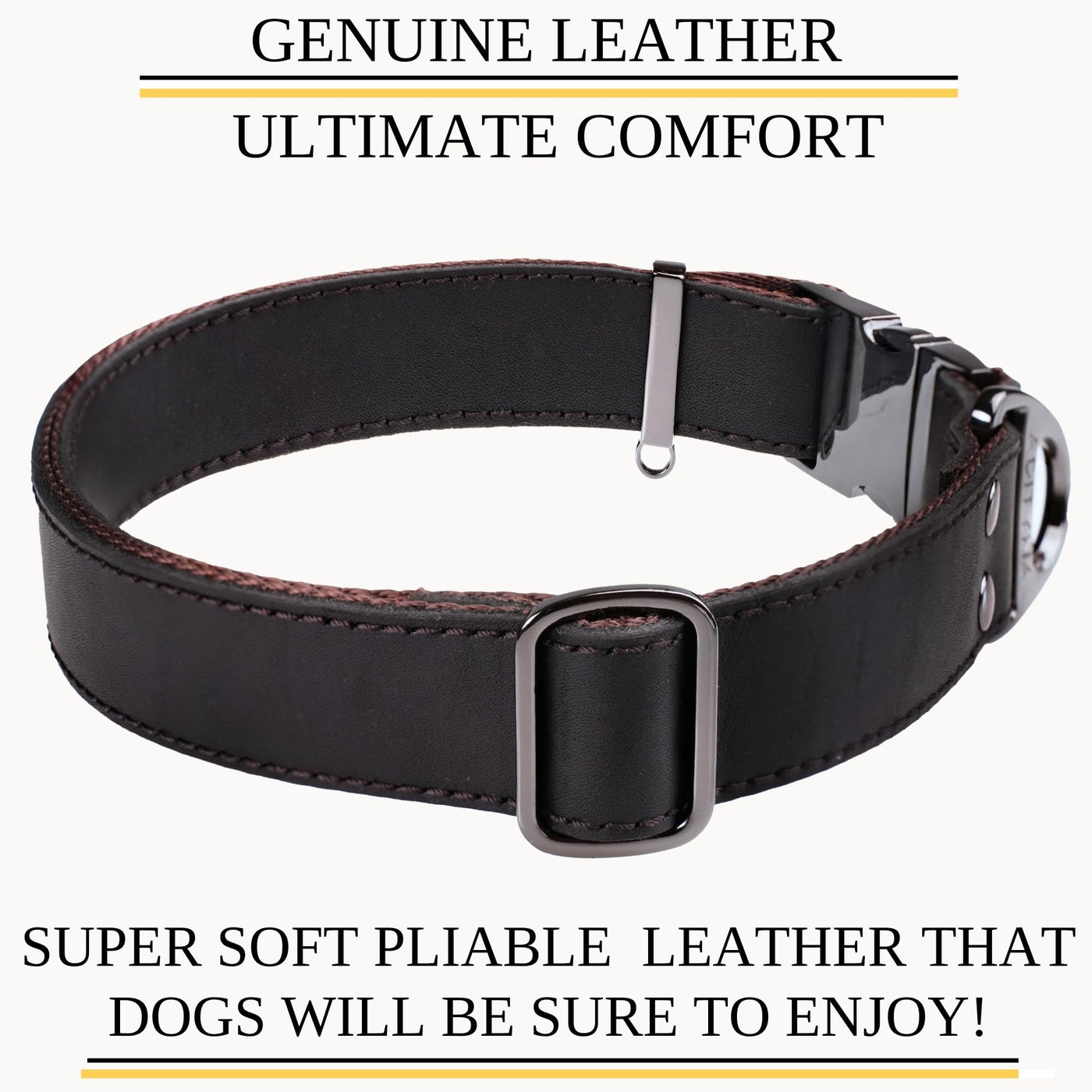 Optimized Fit for Medium-Large Breeds: Perfect for medium to large dogs with neck sizes between 15 to 21 inches and a collar width of 1.25 inches. Ideal for breeds such as the French Bulldog, Poodle, Beagle, Corgi, Dachshund, Boston Terrier, Shetland Sheepdog, Brittany, Pug, Border Collie, Vizsla, and even larger breeds like Labrador, German Shepherd, Golden Retriever, Bulldog, and Boxer. Remember to measure your dog's neck for a perfect fit and refer to our sizing chart for the best selection. Premium Quality Leather Collar: Crafted with your four-legged friend in mind, this adjustable collar is designed for medium to large breeds. Made from high-quality leather, it includes a sturdy metal buckle, a convenient slide ring for dog tags, and a steel D-ring for easy leash attachment. Elegant Handmade Design: Enhance your dog's style with our top-grain leather collar. Each collar is handmade, ensuring durability and elegance, and pairs beautifully with high-end leather leashes. Comes with a deluxe gift package featuring an engraved Dog Tag with a USA Flag design for a touch of patriotism. Enhanced Durability for Peace of Mind: Enjoy worry-free walks with our collar's robust locking system and resilient design, capable of withstanding up to 400lb of pulling force. It's the perfect choice for active dogs and owners seeking reliability. Commitment to Customer Satisfaction: We stand behind our rugged dog collar with a 2-year warranty and dedicated customer support. Our goal is to deliver exceptional quality and durability with each collar, ensuring your satisfaction.