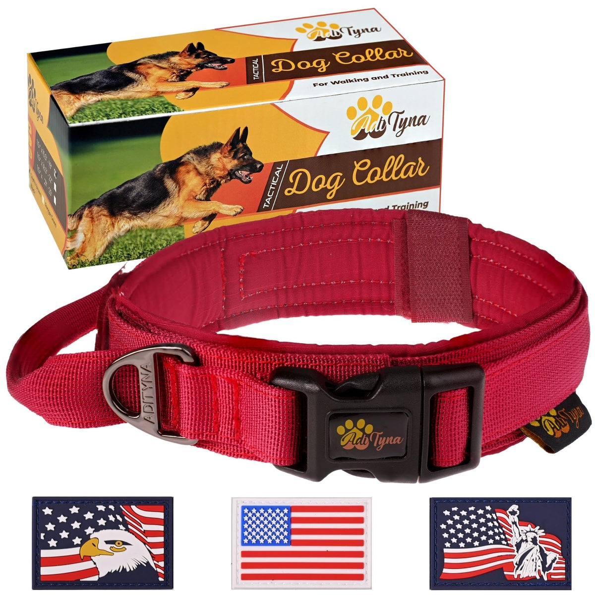 Are You Tired Of Old-Fashioned Large Dog Collars? Are You Looking For A Stylish Tactical Collar For Dogs That Features A Comfortable Traffic Handle For Better Control When Crossing The Street, In High-Traffic Events, At Vet Visits, And Can Be Successfully Used Also With A Dog Leash? Here, At Adityna Weve Built This Heavy-Duty Dog Collar For Large Dogs Made Out Of 1000D Nylon With A Soft Padded Lining As One Of The Most Comfortable K9 Collars On The Market. Maybe You Are Wondering Why Would You Choose A Tactical Collar Among The Plenty Of Others On The Market. Well, We Are Proud To Say That We Are More Than A Manufacturer. We Are A Family Company Where Quality And Love For Dogs Are The Core Fundamentals. As Pet Owners, We Know How Important A Four-Legged Family Member So We Decided To Offer You A Special Bundle. We Add Along With Our Tactical Dog Collar For Large Dogs, 3 Pack Id Patches 2.3 X 1.2 Inches. More Than That Our Adityna Adjustable Dog Collar Has A Dedicated Sticker Id Panel Area - For Id Patches, Just Because We Know How Important Is To Keep Your Best Friend Safe And Easy To Identify. We'Ve Designed This Nylon Dog Collar Available For Almost Any Dog Size. Before Ordering Ensure You Receive The Best-Fitted Size For Your Dog. Please Measure Your Dogs Neck Before Choosing The Size And Then Check The Sizing Table. Dimensions Available: M - 1.5'' X 15.5'' - 19 L - 1.5'' X 18.5'' - 22 Xl - 1.5'' X 21'' - 25'' Width: 1.5 '' Colors: Coyote Brown, Ranger Green, Black, Camo, Pink, Red, Yellow, Purple, Green, Orange, Gray, And Burgundy.