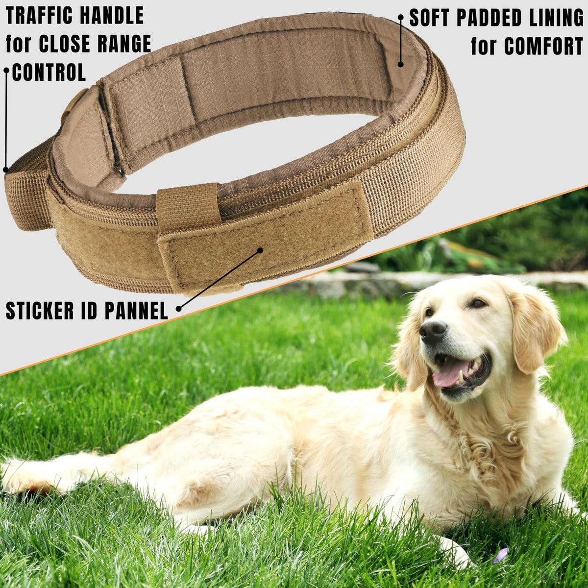 Q: How does the handle on the ADITYNA Tactical Dog Collar improve control?A: The collar includes a comfortable traffic handle, allowing you to easily control your dog in various situations such as crossing the street or during high-traffic events. This feature enhances safety and facilitates better training sessions.