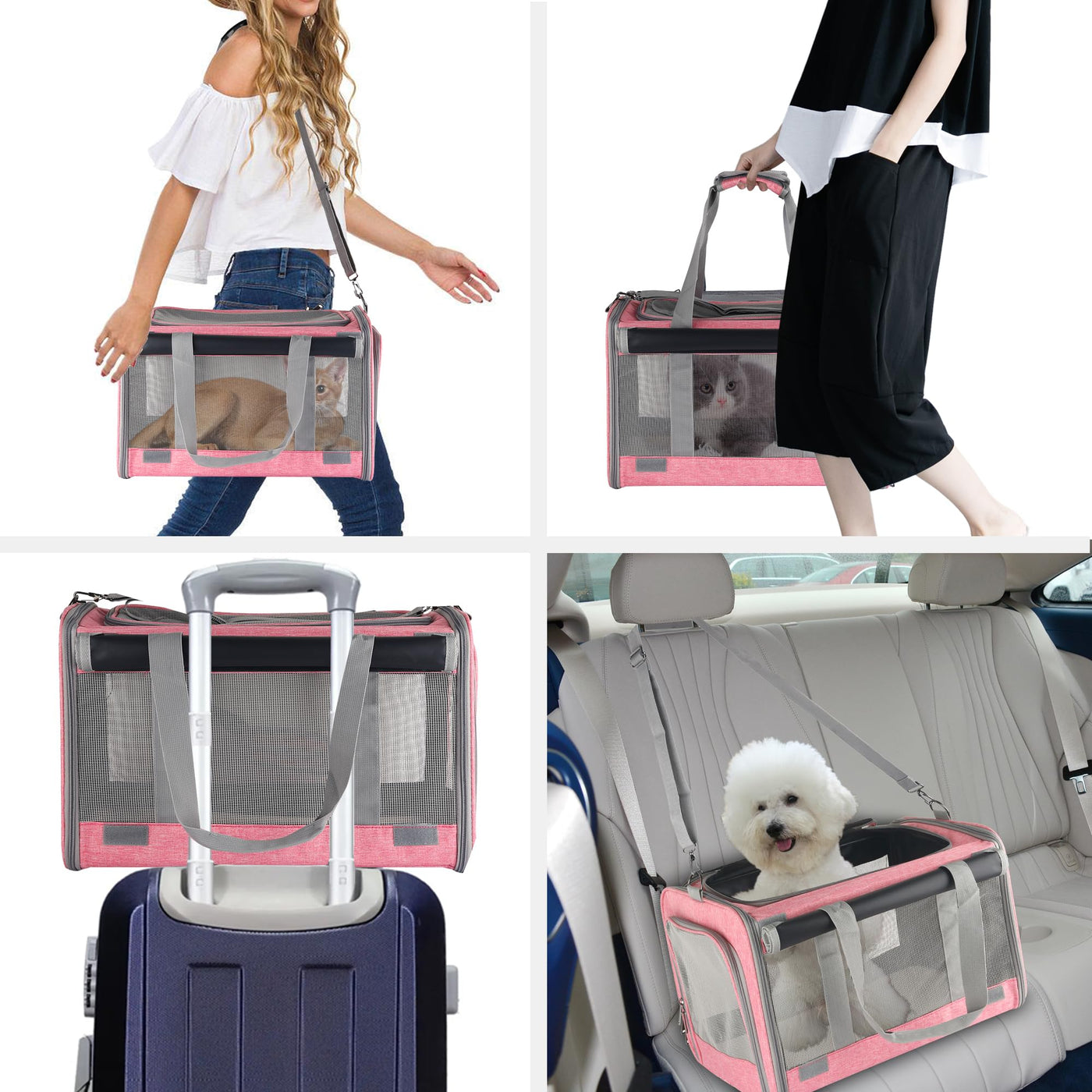 LARGE SIZE PET CARRIER : Color: Pink Length:18.5 inch / 47 CM Width:11.8 inch / 30 CM Height:11.8 inch / 30 CM Maximum Pet Weight: 20 lbs Shoulder Strap length: about 37-49 (adjustable) The Cat CARRIER is FIT for Medium Cats, Large Cats, Two Small Cats, Small dogs, Medium Dogs lighter than 20 LBS Do not fit for large dogs. Please make sure measure your pet before purchase. Product Features 1. Cat carrier is made of high quality fabric-oxford material. Wear-resisting and waterproof. 2. The four-side mesh will not only give a safe and comfortable travel for your pet, but also easy for you to check on your pet 3. Roller shutter design on both sides. 4. Two modes of carrying: handheld and single shoulder. 5. Small zipper pocket is convenient to store treats toys, food 6. The removable insert thickened base plate for support is very strong. Keep the pet from collapsing when standing 7. Zipper opening side is convenient for you to reach pets during travel. PACKAGE INCLUDES 1 x Pet Travel Carrier