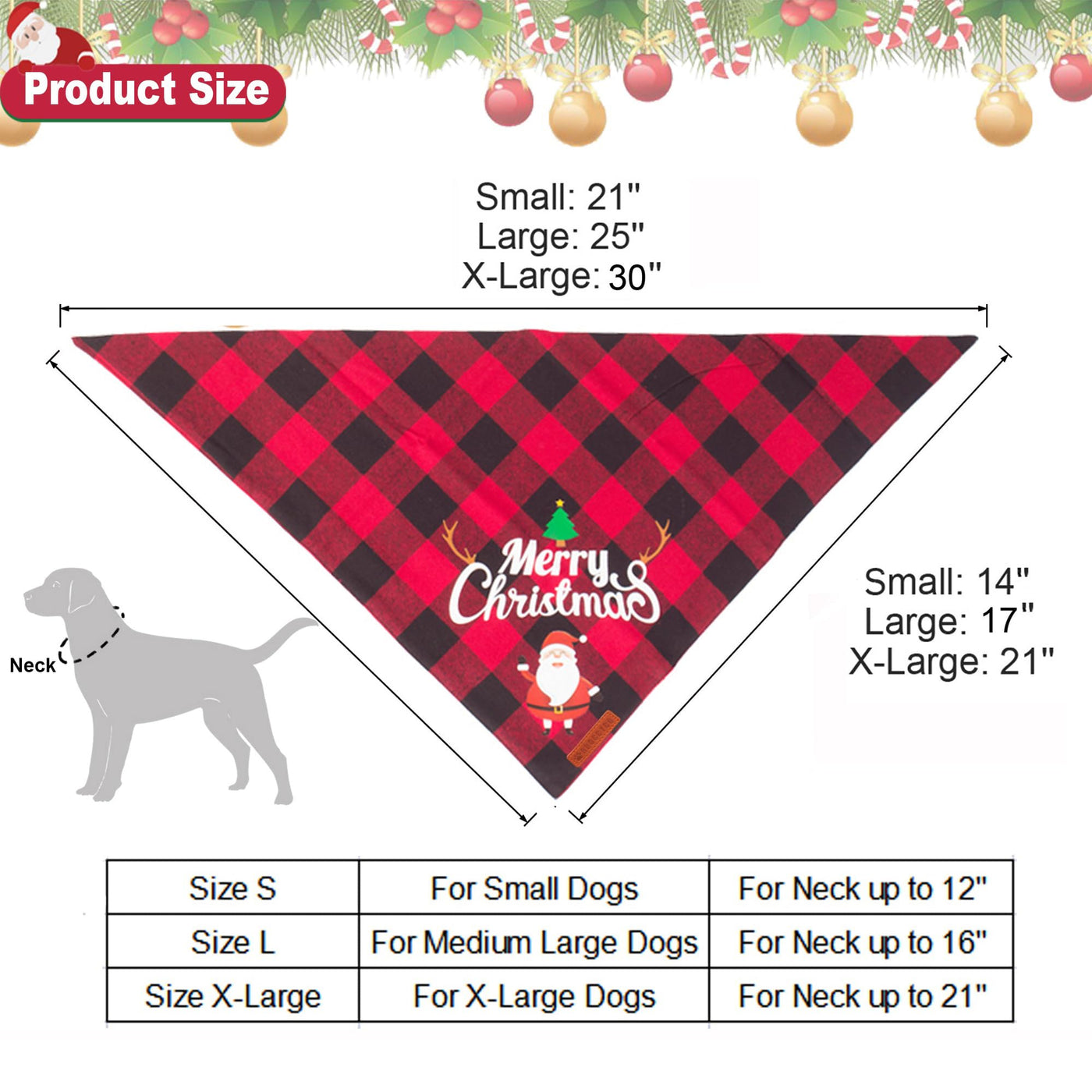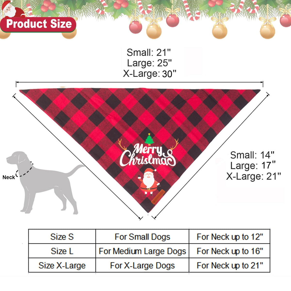 Q: What sizes are available for the Adoggygo Christmas dog bandana?A: The Adoggygo Christmas dog bandana is available in three sizes: Small fits necks up to 12 inches, Large fits necks up to 16 inches, and X-Large fits necks up to 21 inches. Be sure to measure your dog's neck before choosing a size.