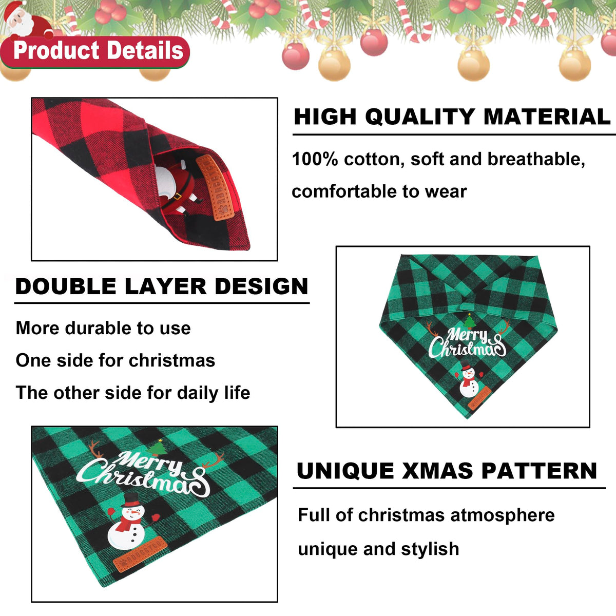 Q: What material are the dog bandanas made of?A: These dog bandanas are made of 100% premium cotton, featuring a double layer for added softness and durability. This material is designed to be comfortable for your pet to wear during the festive season.