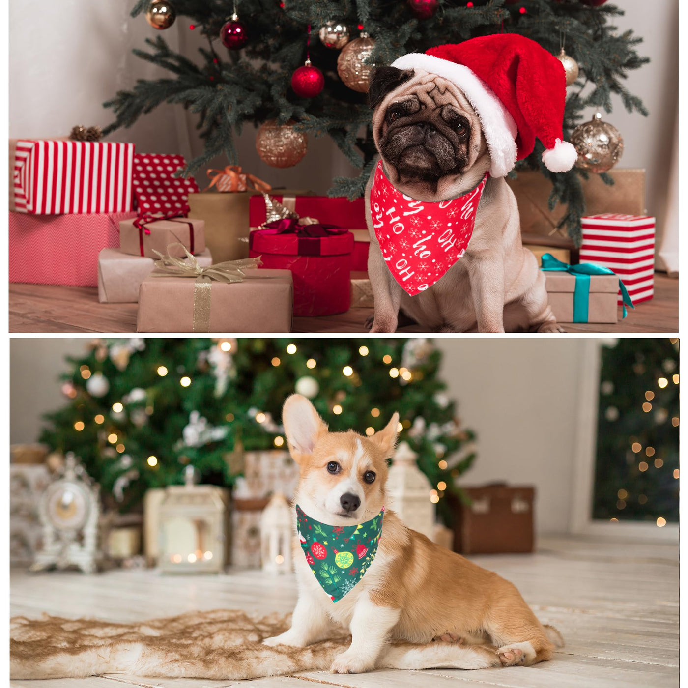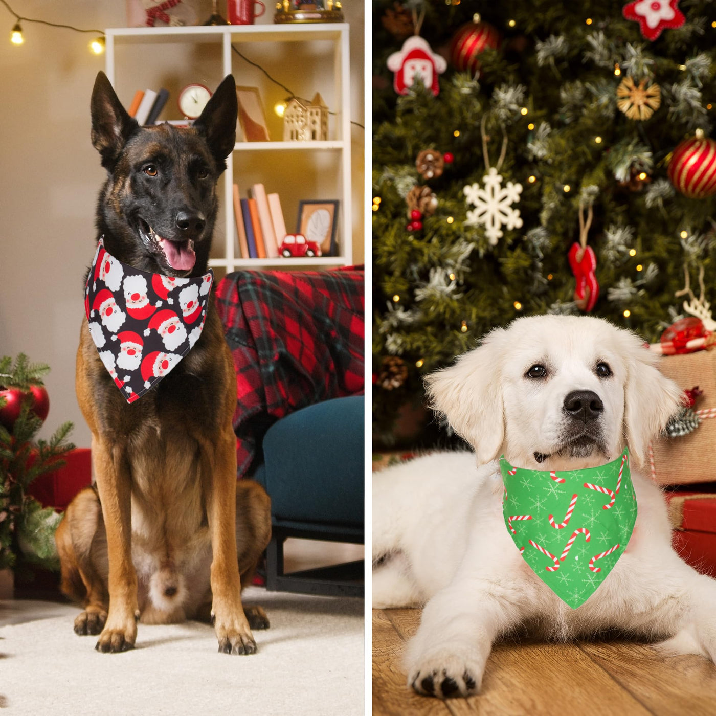 ADOGGYGO Christmas Dog Bandanas Dog christmas Bandana Pet Scarf Triangle Bibs for Dogs Pets, make your pet looks cool on xmas Day! Features: Our pet bandanas contain a variety of christmas elements, and make your dog fashion and attractive during christmas season. Material: polyester, soft and comfortable Color: red and green Design: santa claus, snowflake, christmas tree, xmas candy Multiple Size to Choose: Small size: 14''X14''X21'',suitable for neck size up to 12'' Large size: 19''X19''X27'',suitable for neck size up to 18'' X-Large size: 21''X21''X31'',suitable for neck size up to 22'' Package: 4 x medium large dog bandanas christmas. Let your furry friend join in the festivities of one of the best holidays of the year! Dress Up Now! Note: Please measure the size of your pet and leave room to tie knot.