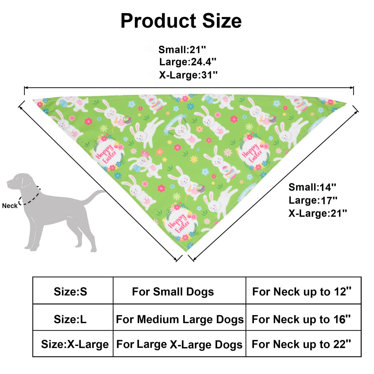 ADOGGYGO 4 Pack Easter Day Dog Bandanas Triangle Pet Holiday Bandanas for Dogs, make your pet looks lovely on easter day. Features:/ Material: polyester, soft and durable, lightweight and breathable Color: white, green, blue and pink Design: cute easter egg and rabbit pattern Multiple Size to Choose: Small size: 14''X14''X21'',suitable for neck size up to 12'' Large size: 19''X19''X27'',suitable for neck size up to 18'' X-Large size: 21''X21''X31'',suitable for neck size up to 22'' Package: 4 x dog easter bandanas Dress Up Now, Let your furry friend join in the easter day! Note: Please measure the size of your pet and leave room to tie knot.