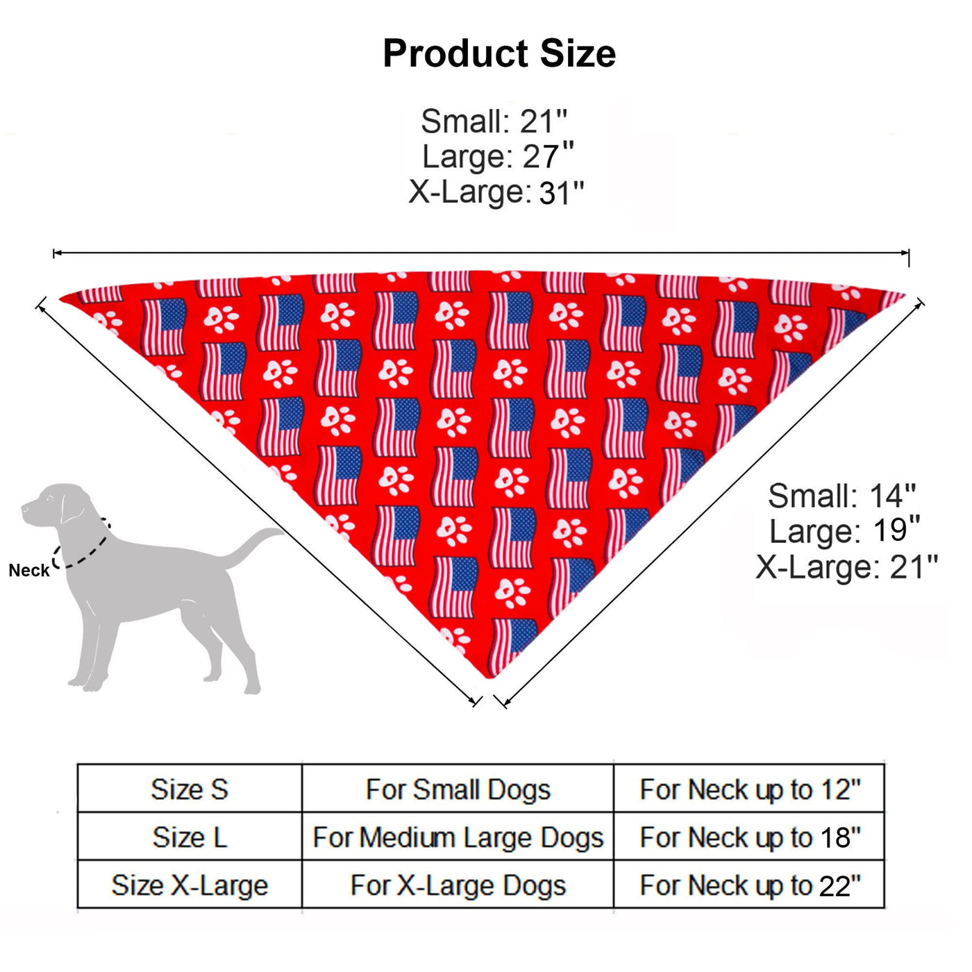 Adoggygo 2 Pack American Flag Dog Bandanas, Cute Patriotic 4Th Of July Dog Bandana For Small Medium Large X-Large Dogs Pets, Make Your Pet Looks Lovely On Independence Day. Material: Polyester, Double Layer, Soft And Durable, Lightweight And Breathable Color: Blue And Red Design: Stripe Star, Paw Pattern Scarf Size: Small Size: 14''X14''X21'',Suitable For Neck Size Up To 12'' / Large Size: 19''X19''X27'',Suitable For Neck Size Up To 18'' / X-Large Size: 21''X21''X31'',Suitable For Neck Size Up To 22'' Widely Use: Ideal For Memorial Day, 4Th Of July, Veterans Day Or For Everyday Wear. Package: 2 X Patriotic Dog Bandanas. Dress Up Now, Let Your Furry Friend Join In The Every Festivals With You! Note: Please Measure The Size Of Your Pet And Leave Room To Tie Knot.
