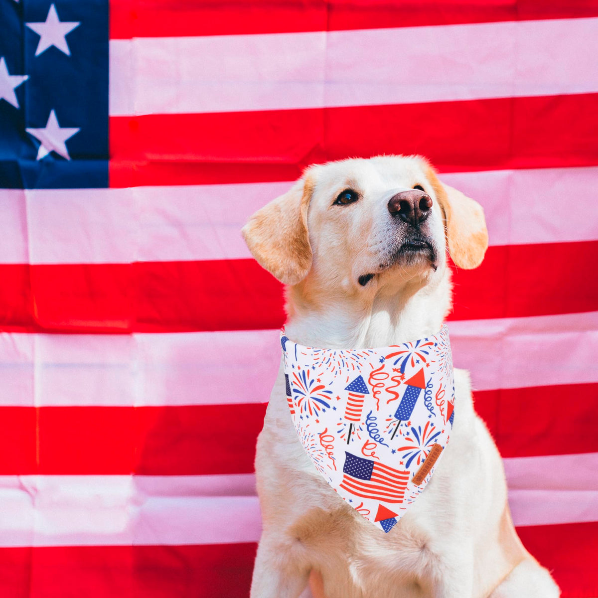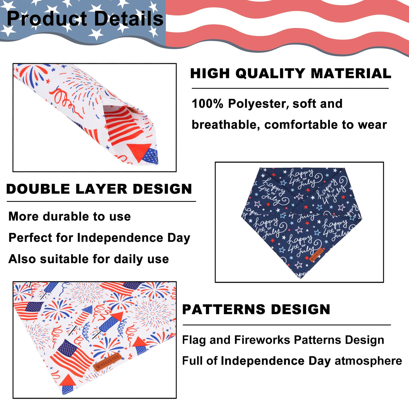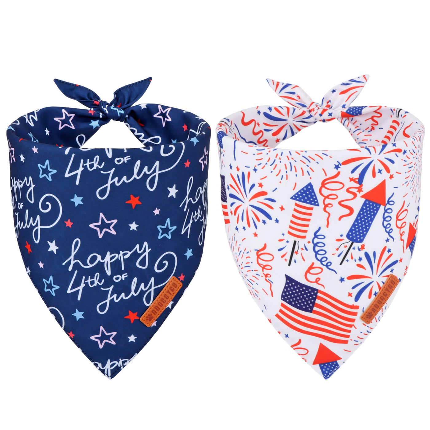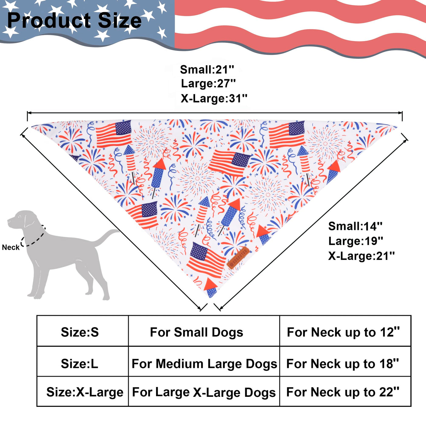 Adoggygo 4th of july dog bandanas are a fun and stylish accessory for pets during Memorial Day, 4th of July, Veterans Day, make your pet look more attractive and eye-catching on holiday, or just during your regular walks, you can choose size according to your dog 's neck size. Features: ''happp 4th of July '' letter, star, flag and fireworks pattern Double layer durable soft polyester fabric Handmade with exquisite sewed Full of 4th of july holiday atmosphere Multiple Size to Choose: Small size: 14 ''X14 ''X21 '',suitable for neck size up to 12 ' ' Large size: 19 ''X19 ''X27 '',suitable for neck size up to 18 ' ' X-Large size: 21 ''X21 ''X31 '',suitable for neck size up to 22 ' ' Package: 2* large and extra large dog patriotic bandanas Let your furry friend join in the coming holidays with adoggygo dog bandanas and collars! Dress Up Now! How to measure your dog 's neck size? Use fabric tape measure to measure your dog 's neck, If you don 't have one, you can use a string and measure with common tape measure. Please measure the thickest part of your dog 's neck where usually his collar would sit. If your dogs are between 2 size or are fluffy, please choose the larger size. For young puppies, you may have to roll the bandana a bit then tie.