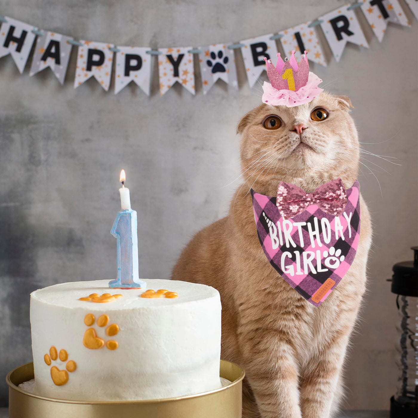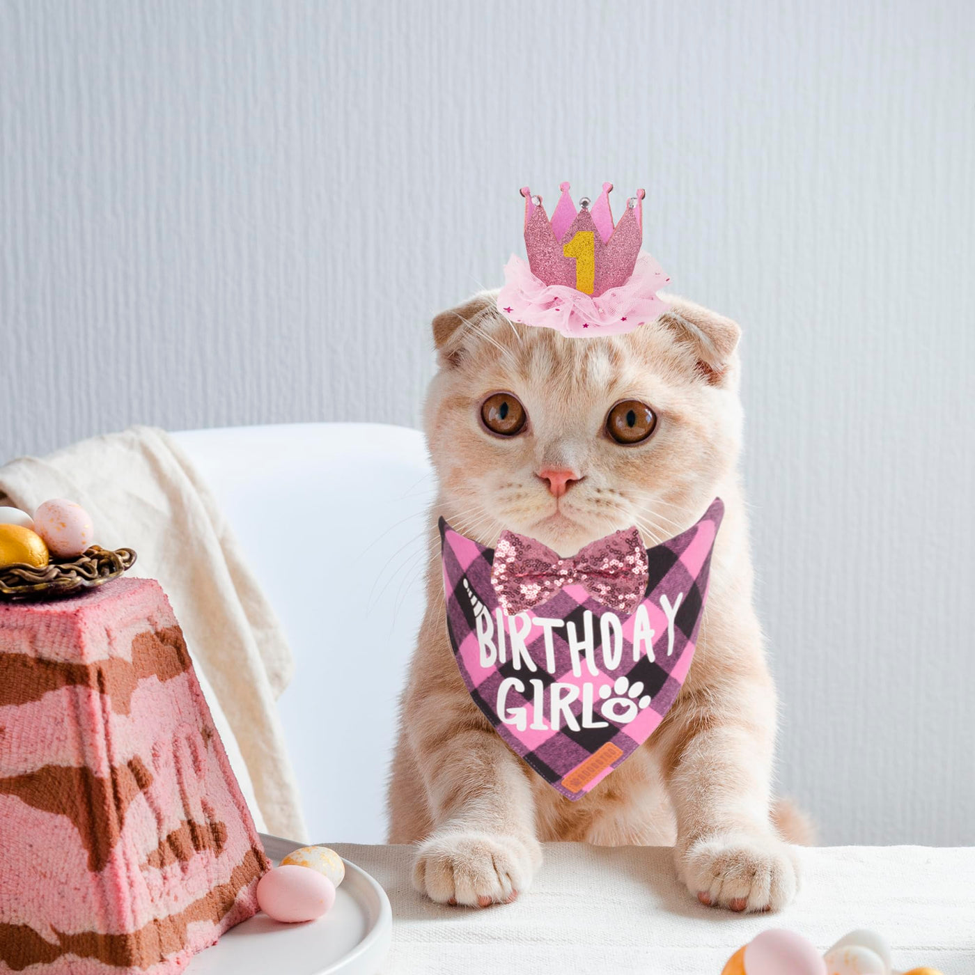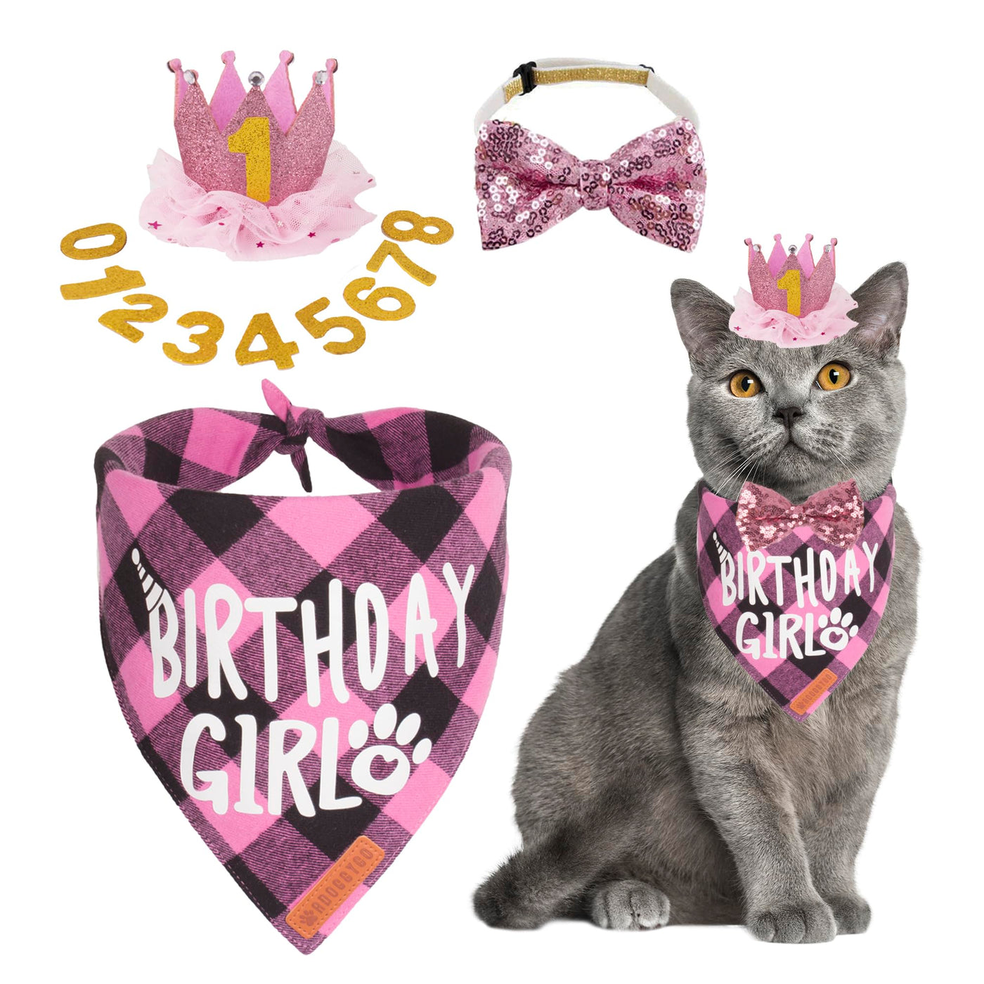 Adoggygo Cat Birthday Party Supplies, Birthday Girl Plaid Kitten Bandana, Pink Cat Party Hat With Numbers, Bowtie (Pink)