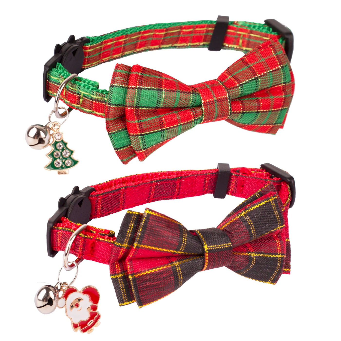 Adoggygo Christmas Cat Collars With Bow Bell, Breakaway Red Green Plaid Christmas Bowtie Collars For Girl Boy Cats Kittens
