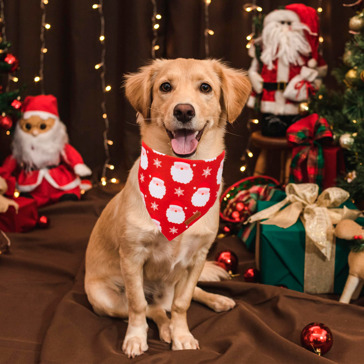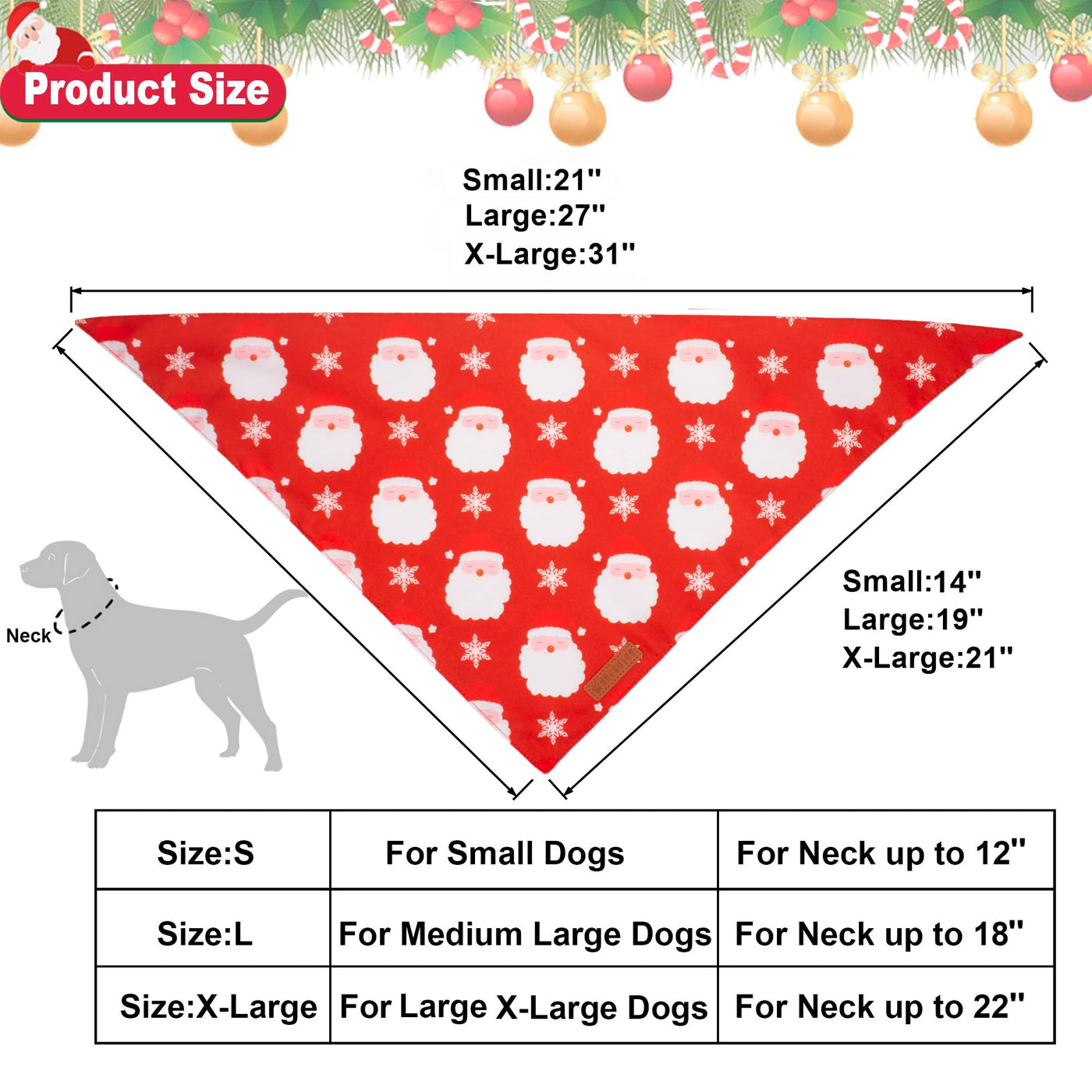 Adoggygo christmas dog bandanas are a fun and stylish accessory and gift for pets during christmas holiday, make your pet look more attractive and eye-catching on xmas, new year, winter season, photo shoot with your family or santa, regular walking wear during holiday, you can choose size according to your dog's neck size. Features: Traditional christmas red green color Xmas-themed santa, snowflake, string lights and deer pattern Double layer durable soft polyester fabric Handmade with exquisite sewed Full of festival atmosphere Multi occasions you'd like to dress up your pets Multiple Size to Choose: Small size: 14''X14''X21'',suitable for neck size up to 12'' Large size: 19''X19''X27'',suitable for neck size up to 18'' X-Large size: 21''X21''X31'',suitable for neck size up to 22'' Package: 1* red santa extra large dog christmas bandana, 1*green deer xmas dog bandana scarf Let your furry friend join in the coming holidays with adoggygo dog bandanas and collars! Dress Up Now! How to measure your dog's neck size? Use fabric tape measure to measure your dog's neck, If you don't have one, you can use a string and measure with common tape measure. Please measure the thickest part of your dog's neck where usually his collar would sit. If your dogs are between 2 size or are fluffy, please choose the larger size. For young puppies, you may have to roll the bandana a bit then tie.