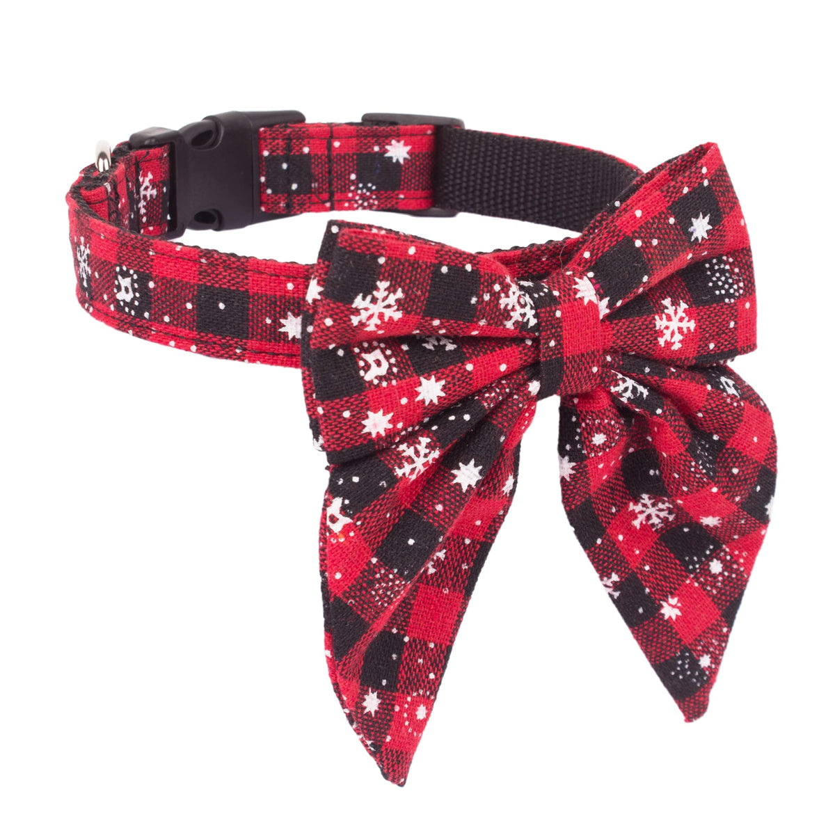 Features: 1. Christmas Design Designed with classic red&black plaid with snowflake pattern. Cute dog collars make your pet lovely on christmas holiday. 2. Removable New Style Bowtie The new bow's style is unique and the pattern is more easier to see. it is removable with 2 elastic bands. You can adjust the position of the bowtie to show it on the front of your dog's neck. 3. Safe and Durable Design durable buckle releases when you press the button, easy to put on and off. very safe for your pet. Also with a stainless steel D rings to attach tag or leash. 4. 3 Size for Selection size S fit pet's neck girth from 11'-15.5', size M fit from 13.5'-19.5', size L fit from 16'-23.5', please choose suitable dog collar for your dogs 5: High Quality Material Made of soft cotton, comfortable to wear.