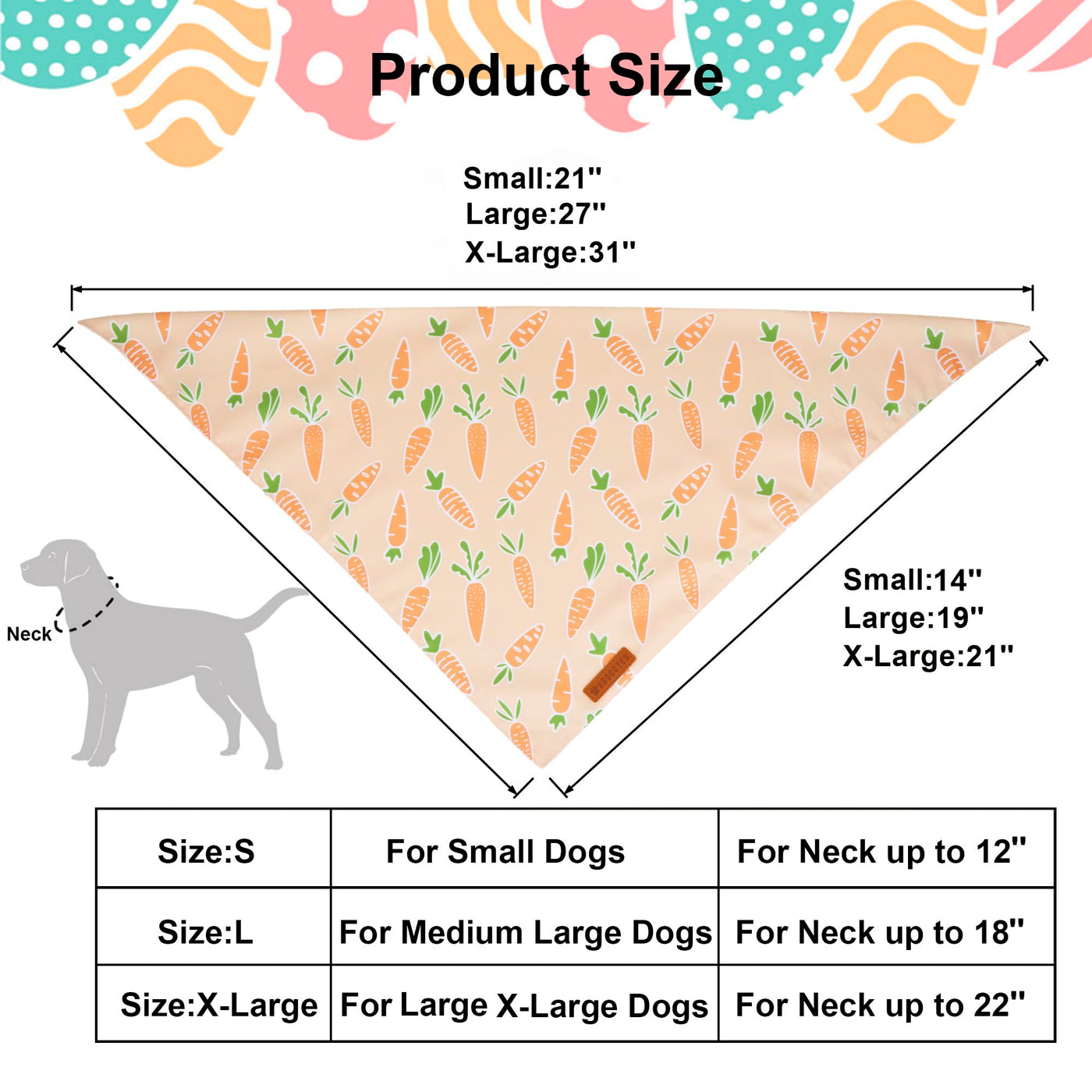 Adoggygo easter dog bandanas is essential holiday gift to your dog, add unique fashion holiday styles to your pets on easter day, photo shoots, parties, or any occasions you'd like to dress up your pets, you can choose size according to your dog's neck size. Features: Double layer durable polyester fabric Handmade with exquisite sewed Blue orange color dog bandana Rabbit and carrot pattern dog easter scarf Full of easter day atmosphere Multiple Size to Choose: Small size: 14''X14''X21'',suitable for neck size up to 12'' Large size: 19''X19''X27'',suitable for neck size up to 18'' X-Large size: 21''X21''X31'',suitable for neck size up to 22'' Package: 1* blue rabbit easter dog bandanas, 1* orange carrot dog easter bandana Let your furry friend join in the coming holidays with adoggygo dog bandanas and collars! Dress Up Now! How to measure your dog's neck size? Use fabric tape measure to measure your dog's neck, If you don't have one, you can use a string and measure with common tape measure. Please measure the thickest part of your dog's neck where usually his collar would sit. If your dogs are between 2 size or are fluffy, please choose the larger size. For young puppies, you may have to roll the bandana a bit then tie.