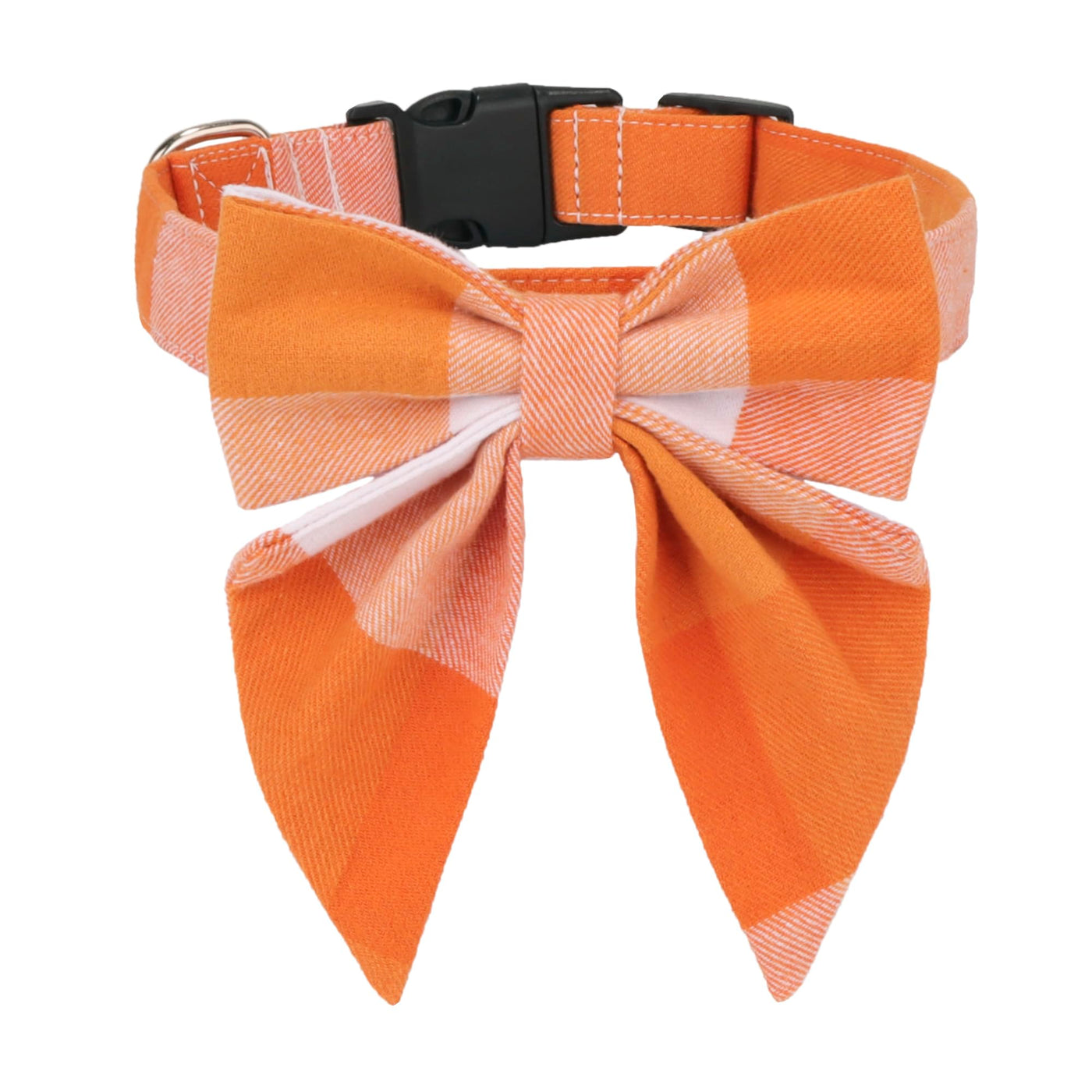 Features: 1. Fall Design: Designed with stylish orange plaid pattern. Cute dog collars make your pet lovely during fall season. 2. Removable Stylish Dog Bowtie: The dog bow's style is unique and adorable. it is removable with 2 elastic bands. You can adjust the position of the bowtie to show it on the front of your dog's neck. 3. Safe and Durable Design: durable buckle releases when you press the button, easy to put on and off. very safe for your pet. Also with a stainless steel D rings to attach tag or leash. 4. 3 Size for Selection: size S fit pet's neck girth from 11'-15.5', size M fit from 13.5'-19.5', size L fit from 16'-23.5', please choose suitable dog collar for your dogs 5: High Quality Material: Made of soft cotton, comfortable to wear.