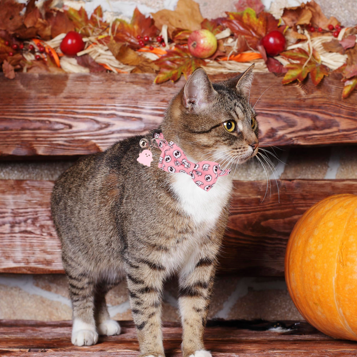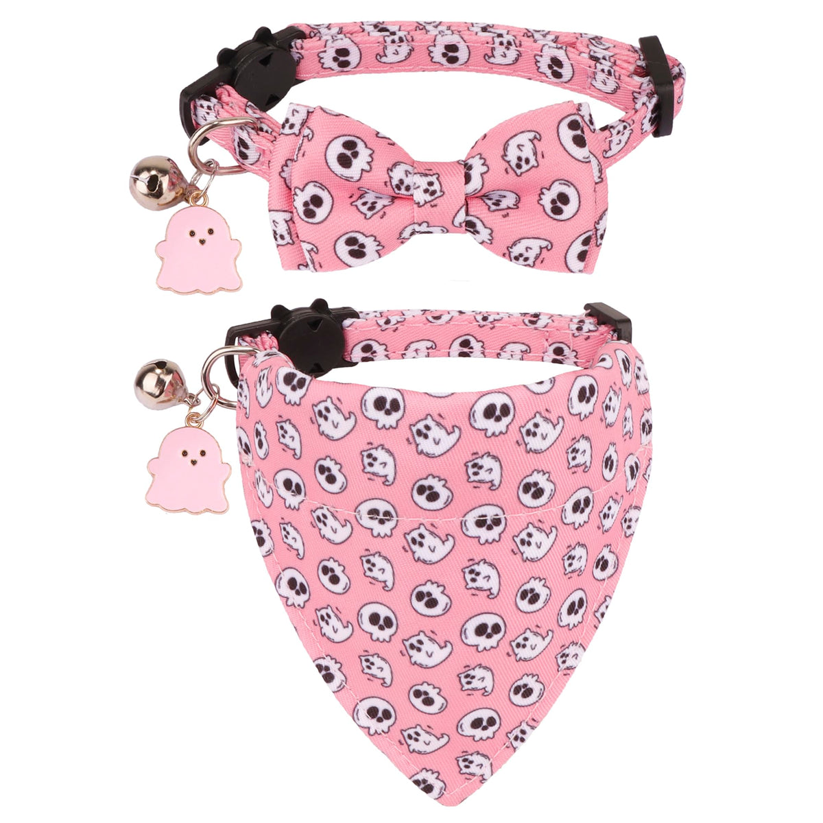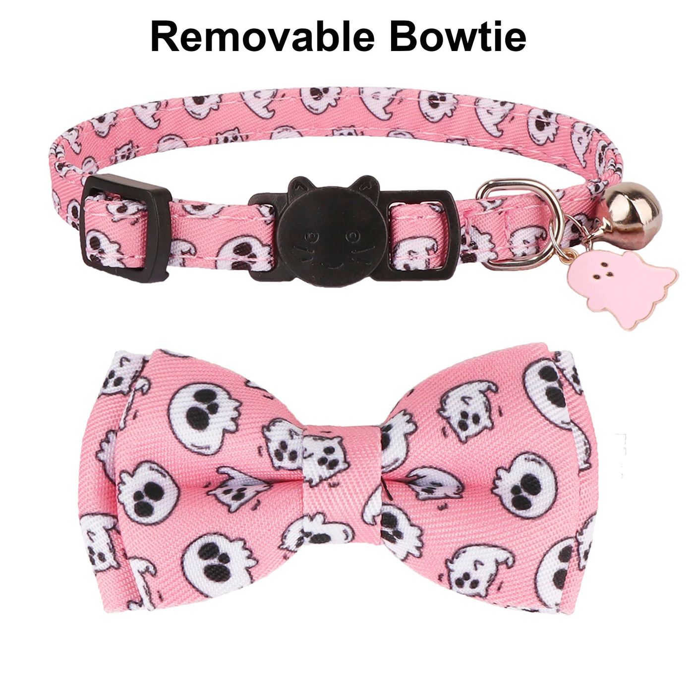 Adoggygo Pink Halloween Cat Collar With Bowtie Bell, 2 Pack Halloween Kitten Collar With Removable Bow, Pink Skull Ghost Collars