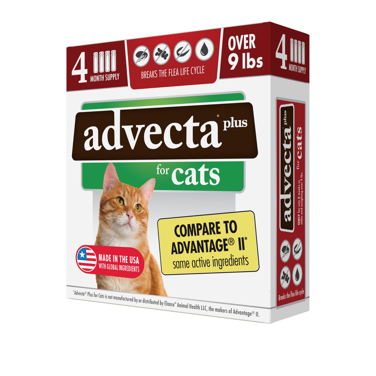 Advecta Plus for Cats (9lbs and Over) contains the same active ingredients used in Advantage II for Cats. Advecta II is a convenient, easy-to-apply topical solution for the prevention and treatment of fleas on cats 8 weeks of age and older. Kills fleas on cats within 12 hours of application and continues to prevent reinfestations for up to 4 weeks. This flea treatment is a waterproof, fragrance-free formula