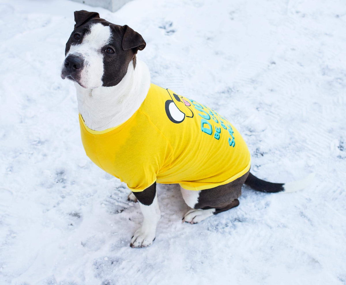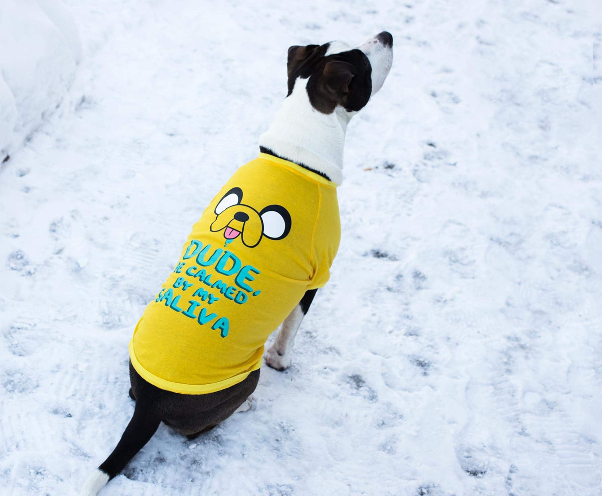 What's the time? Adventure Time for your pet! The Adventure Time Pet Collection from A Crowded Coop was made with the cartoon-lover in mind! This fun shirt features Jake's face with the text 'Dude, Be Calmed By My Saliva'. Small: girth- 15”-18”, length – 8.5” – 9”; Medium: girth – 17” – 20”, length – 13”- 13.5”; Large: girth – 20”-23”, length – 16”-16.5”; X-Large: girth - 22” – 25”, Length – 19.”-19.5”; XX-Large: girth - 25”- 28”, length - 22”-22.5”. Officially licensed.