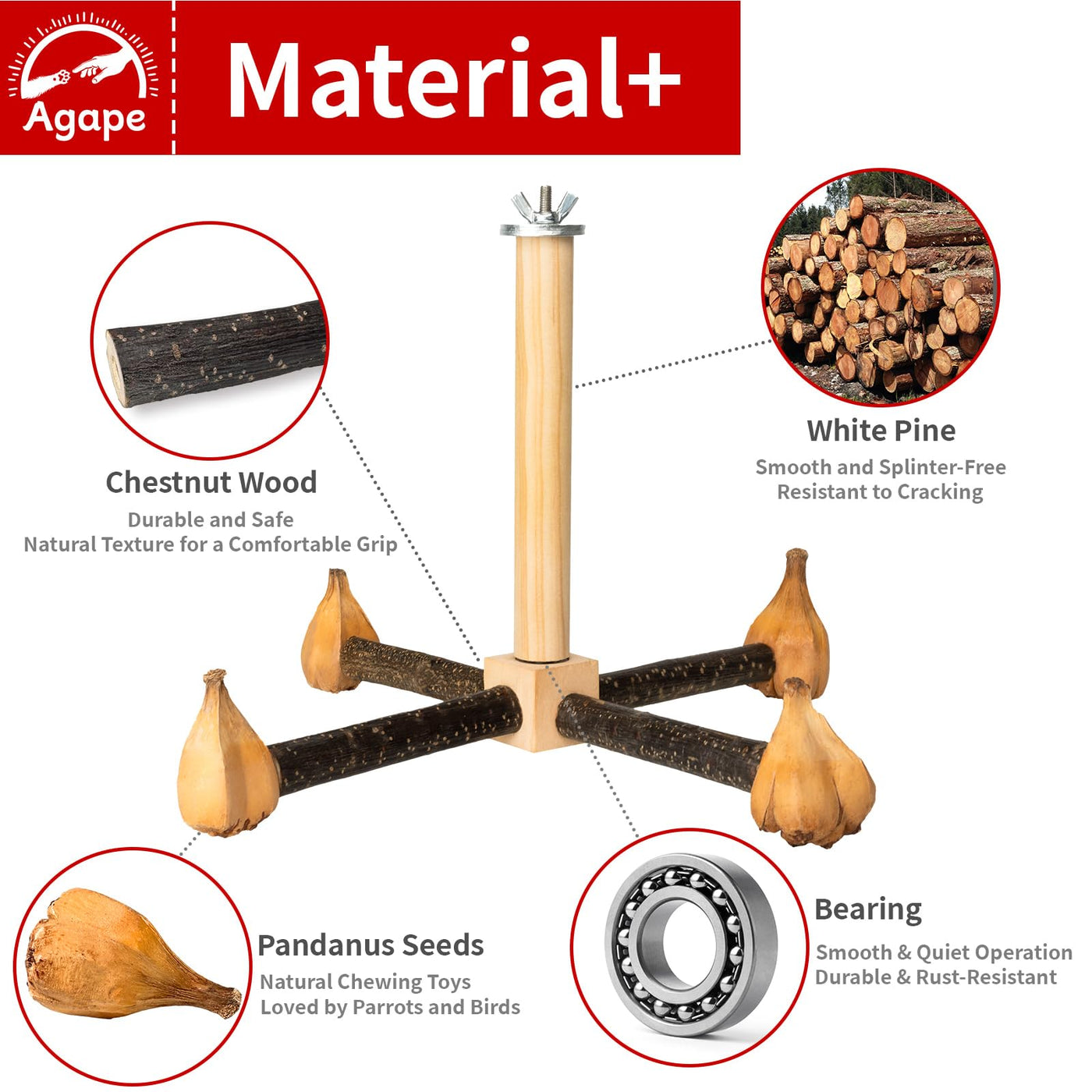 ?Rest & Play?This Product Features Four Perches With Durable Bearings, Allowing It To Rotate Freely 360. It Seamlessly Combines Rest, Play, And Exercise, Providing Long-Lasting Entertainment And Stimulation For Your Bird. Plus, You Can Manually Rotate The Perches To Enhance Interaction And Bonding Time With Your Feathered Friend ?Natural Materials?This Perch Is Made From All-Natural Materials. The Standing Rods Are Crafted From Chestnut Wood, Featuring Natural Grain Patterns That Provide A Secure Grip For Your Bird. The Vertical Poles Are Made From Durable Pine Wood, Resistant To Cracking And Built To Last. The Chew Toys Are Made From Safe, Natural Materials That Parrots Love To Chew On, Offering Both Entertainment And Promoting Healthy Beaks ?Flexibility?The Product Can Be Placed Inside Or Outside The Cage, On Top, At The Bottom, Or Even On The Sides, Offering Great Flexibility To Meet Your Birds Needs For Standing And Playing In Various Locations ?Dimensions?Assembled Dimensions: 9'' L X 9'' W X 11'' H. If Placing Inside The Cage, Please Confirm The Dimensions Before Purchase. Suitable For Parakeets, Budgies, Budgerigars, Parrots, Canaries, Cockatiels, Parrotlets, Lovebirds, Ringnecks, Conures, Caiques, Lorikeets, Forpus, And Other Small To Medium-Sized Birds ?Agape Support?As A Company Dedicated To Providing Exceptional Services For Pets, We Offer 24/7 Friendly Support To Ensure Your Complete Satisfaction