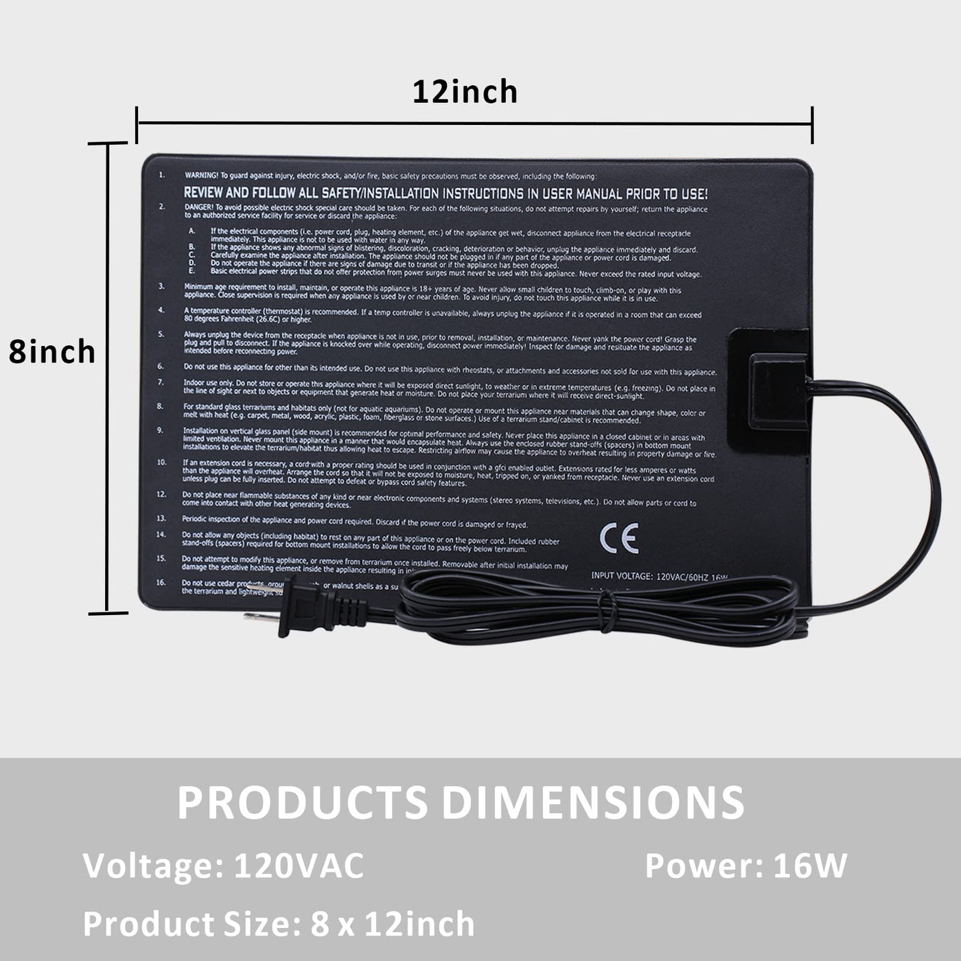 Aiicioo Under Tank Heater are an ideal 24-hour primary or secondary heat source for tropical or temperate reptilian species. All of Aiicioo Under Tank Heater are UL approved in the US and CE approval in Europe. It contains a high level nichrome heating wire and great PVC material to insulation which can provide gently and durable warmth for reptiles and amphibians. Under tank heater permanently adhere to your terrarium or incubator, forming a solid bond for optimum heat transfer. Under tank heater can be placed underneath the tank or on the side of the tank depending on your set up. The under tank heater should be placed on the outside of the tank only. If you choose to place the heater on the underside of the tank, be sure to elevate the tank slightly using the included 'bump-on feet' or another method to prevent heat encapsulation. Please be sure to read the instructions carefully.