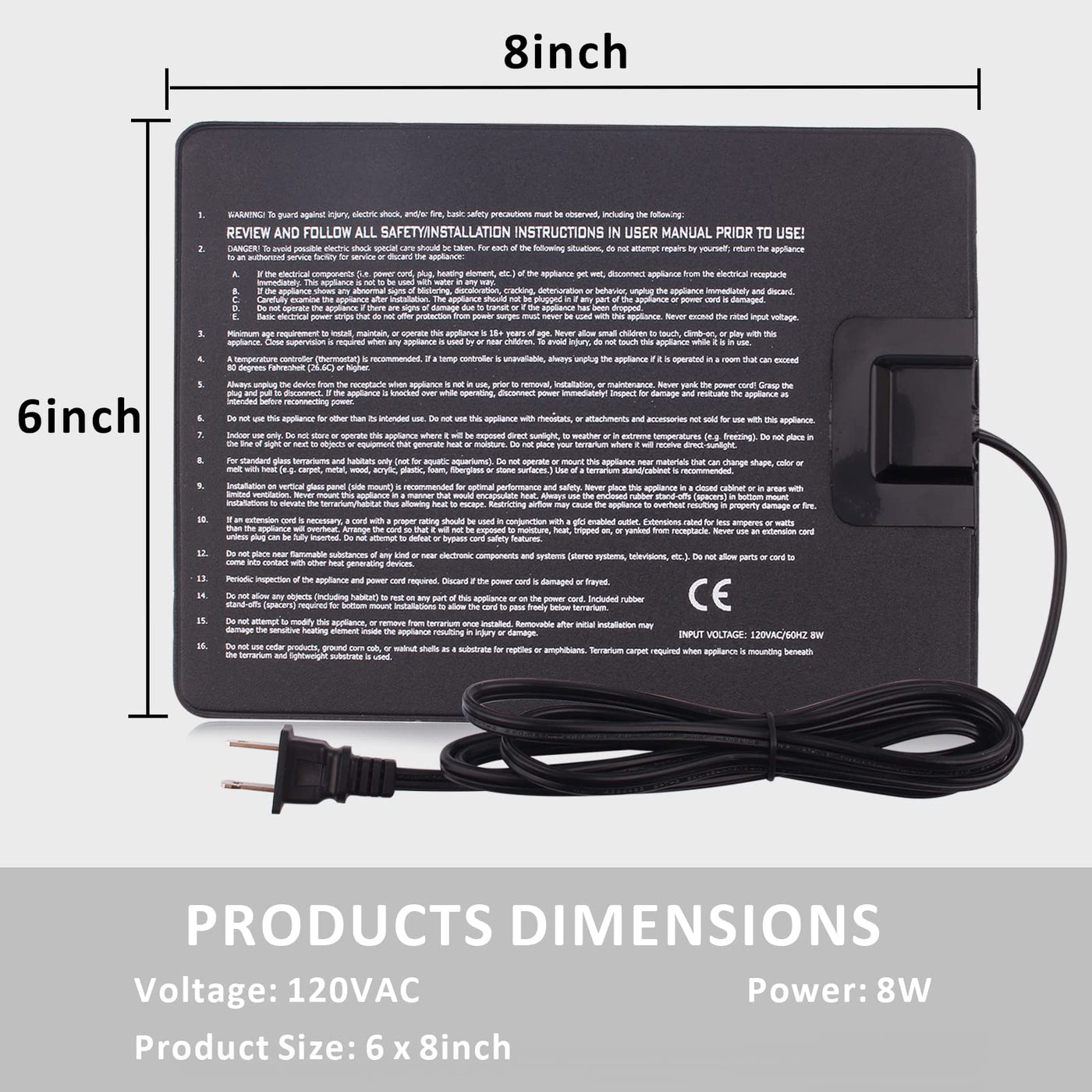 Q: How do I install the reptile heating pad?A: The heating pad can be installed either underneath the tank or on the side, depending on your setup. If placing it under the tank, ensure to elevate the tank slightly using the included bump-on feet to prevent heat encapsulation.