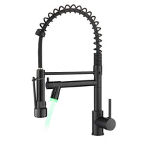 BLAcK KITcHEN FAUcET DESIgN - Multiple layer protection matte black kitchen faucet resists rust corrosion and tarnishing daily maintenance is simple ONLY clean with a soft damp cloth gentlykeeps its smooth and flawless appearance easily Black kitchen sink faucet features - single handled control of both water flow and temperature It is high arched with 360 degrees swiveling The water faucet hose extends to a full 24A available for outside sink range operation This LED Kitchen Faucet color of LED lights changes automatically via water temperatureLED works by water flow No battery is needed The color changes according to the water temperature commercial Design & High quality: Heavy duty sturdy commercial style spring kitchen faucet design suitable for big sink or granite counter tops Lead-free solid brass body construction and spring construction ensure safer and healthier water way High quality ceramic cartridge has passed 500 000 cycle high-quality rust-proof matte black finish rust-proof surface treatment high temperature resistant PEX hose EASY DIY INSTALLATION - All parts of kitchen faucet with sprayer are pre-installed All you need installation tool is an adjustable wrench for connecting supply line valve In most cases 20 minutes is enough Lifetime free replacement Please feel free to contact us if you have any problem with the faucet we will try our best to help