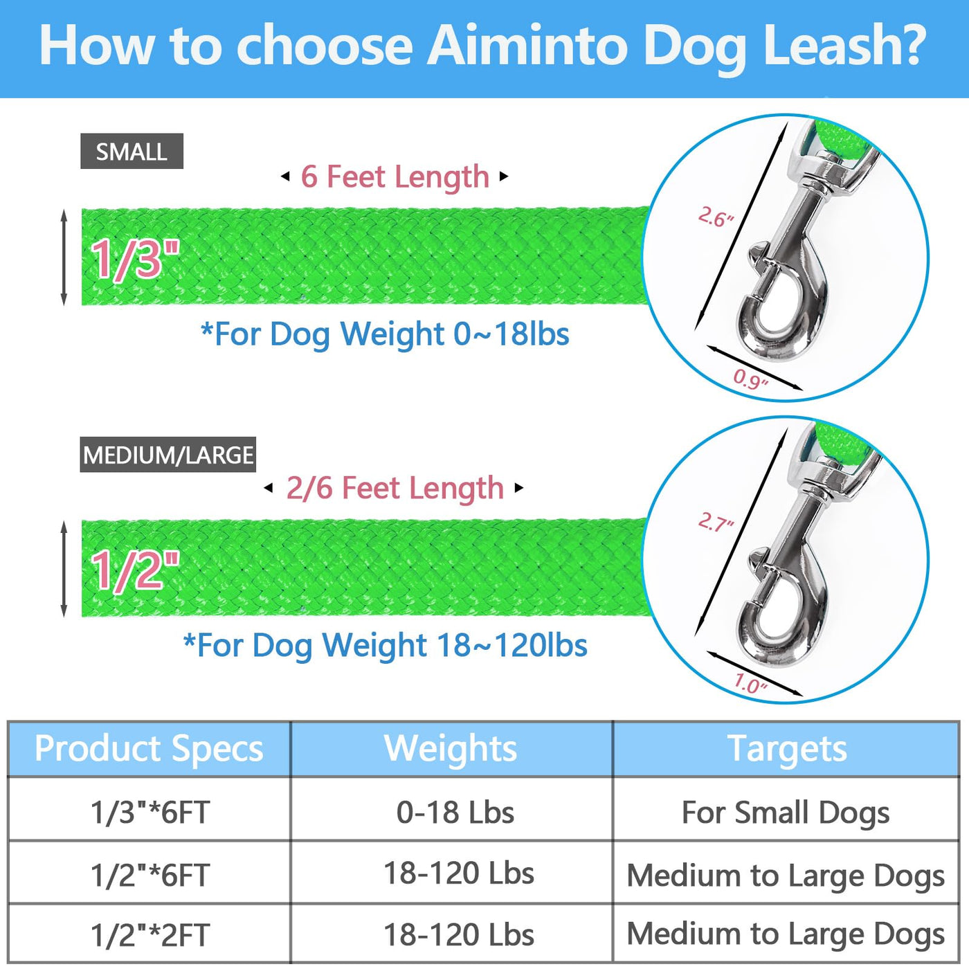 Why choose us? Our vision - Strive to bring Safety, good-quality, appealing design to all dog lovers. Over 25 years experience - We have been learning and upgrading to make dogs feel more comfortable with Aiminto products and simultaneously ensure our products are in good condition in quality and trendy design. Aiminto Nylon Rope Leash - Make Your Dog Walking and Training Under Control! Dogs can get very hyper during trainings, and it 's especially hard to control them when you 're dealing with a large breed. Aiminto 's Nylon Rope Leash is your ultimate choice to ensure your dog is under control. These leashes incorporate tightly-sewn high-grade Polyester fabric that 's destined to last. Because of its durable and robust build, Aiminto 's Durable Rope Leash is the best leash for dog training! The secure metal clasp is very easy to operate and also ensures maximum safety for your dog. Strong Polyester Build - Maximum Durability & Comfort Polyester fabric can withstand a high magnitude pull force and thus, makes it easy to control your dog during trainings, making it the best choice for a dog leash. So, it doesn 't matter if you have a furry friend who likes to get aggressive during training time - the Aiminto dog leash has it handled!