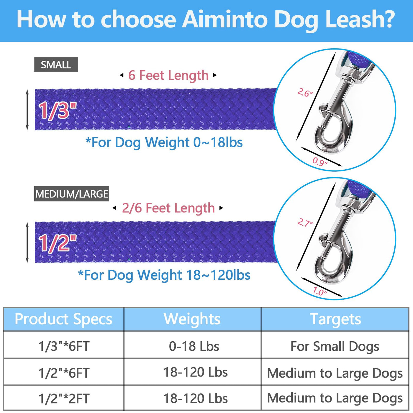 Why choose us? Our vision - Strive to bring Safety, good-quality, appealing design to all dog lovers. Over 25 years experience - We have been learning and upgrading to make dogs feel more comfortable with Aiminto products and simultaneously ensure our products are in good condition in quality and trendy design. Aiminto Nylon Rope Leash - Make Your Dog Walking and Training Under Control! Dogs can get very hyper during trainings, and it 's especially hard to control them when you 're dealing with a large breed. Aiminto 's Nylon Rope Leash is your ultimate choice to ensure your dog is under control. These leashes incorporate tightly-sewn high-grade Polyester fabric that 's destined to last. Because of its durable and robust build, Aiminto 's Durable Rope Leash is the best leash for dog training! The secure metal clasp is very easy to operate and also ensures maximum safety for your dog. Strong Polyester Build - Maximum Durability & Comfort Polyester fabric can withstand a high magnitude pull force and thus, makes it easy to control your dog during trainings, making it the best choice for a dog leash. So, it doesn 't matter if you have a furry friend who likes to get aggressive during training time - the Aiminto dog leash has it handled!