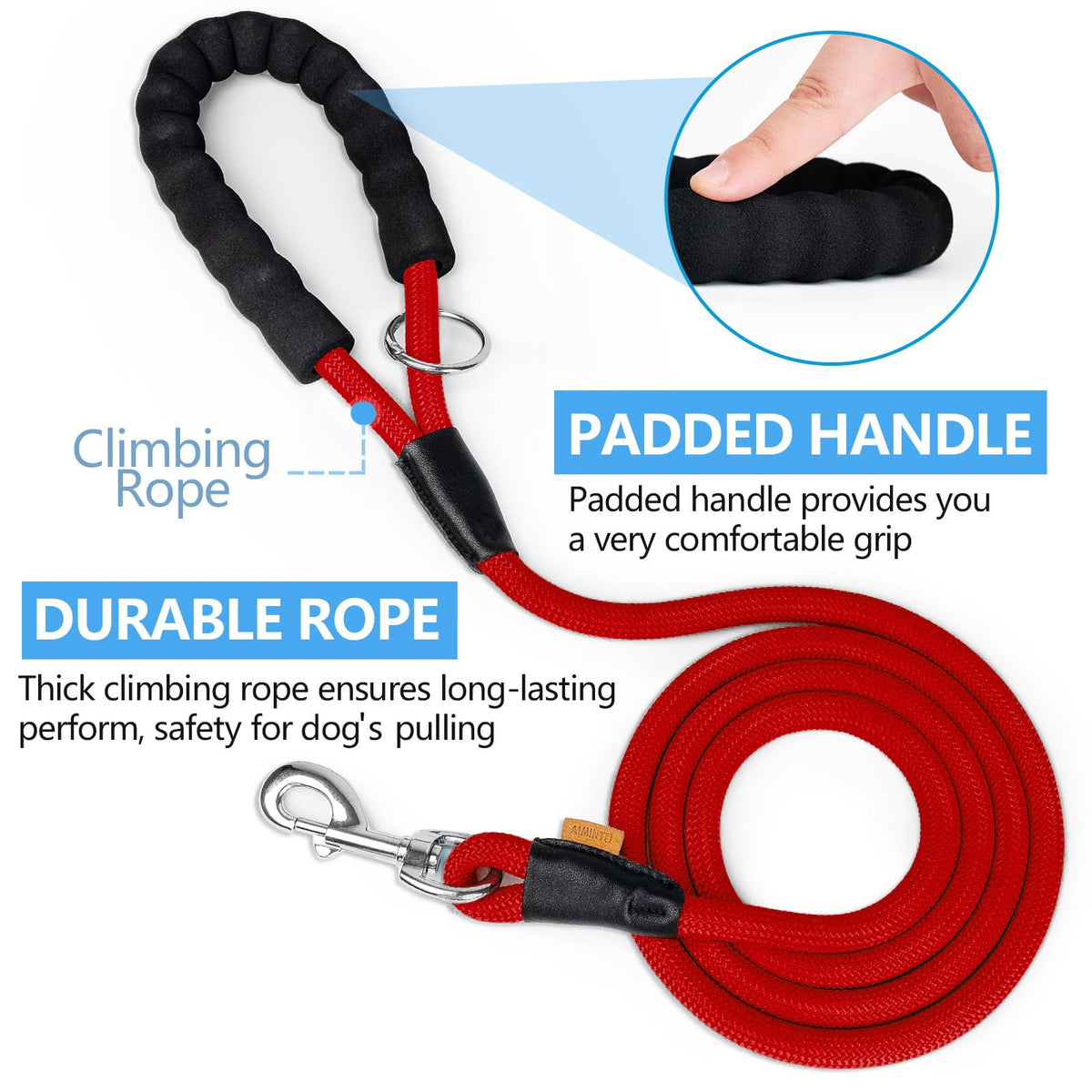 Why choose us? Our vision - Strive to bring Safety, good-quality, appealing design to all dog lovers. Over 25 years experience - We have been learning and upgrading to make dogs feel more comfortable with Aiminto products and simultaneously ensure our products are in good condition in quality and trendy design. Aiminto Nylon Rope Leash - Make Your Dog Walking and Training Under Control! Dogs can get very hyper during trainings, and it 's especially hard to control them when you 're dealing with a large breed. Aiminto 's Nylon Rope Leash is your ultimate choice to ensure your dog is under control. These leashes incorporate tightly-sewn high-grade Polyester fabric that 's destined to last. Because of its durable and robust build, Aiminto 's Durable Rope Leash is the best leash for dog training! The secure metal clasp is very easy to operate and also ensures maximum safety for your dog. Strong Polyester Build - Maximum Durability & Comfort Polyester fabric can withstand a high magnitude pull force and thus, makes it easy to control your dog during trainings, making it the best choice for a dog leash. So, it doesn 't matter if you have a furry friend who likes to get aggressive during training time - the Aiminto dog leash has it handled!