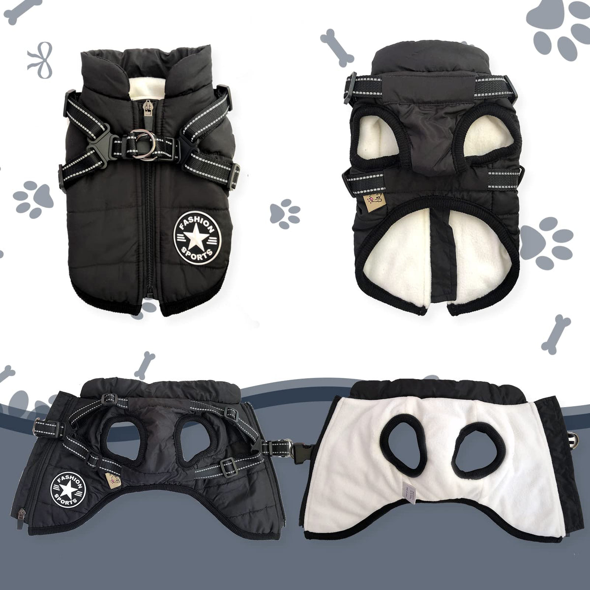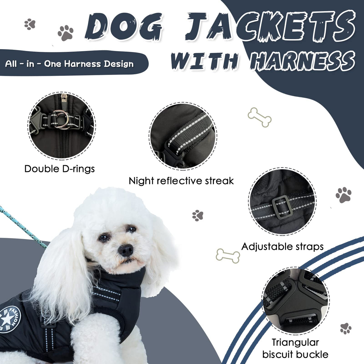 Q: How does the harness design of this dog coat work?A: The coat features an integrated harness design with double D-rings and a strong buckle, making it easy to attach a leash. This design ensures safety and convenience while walking your dog.