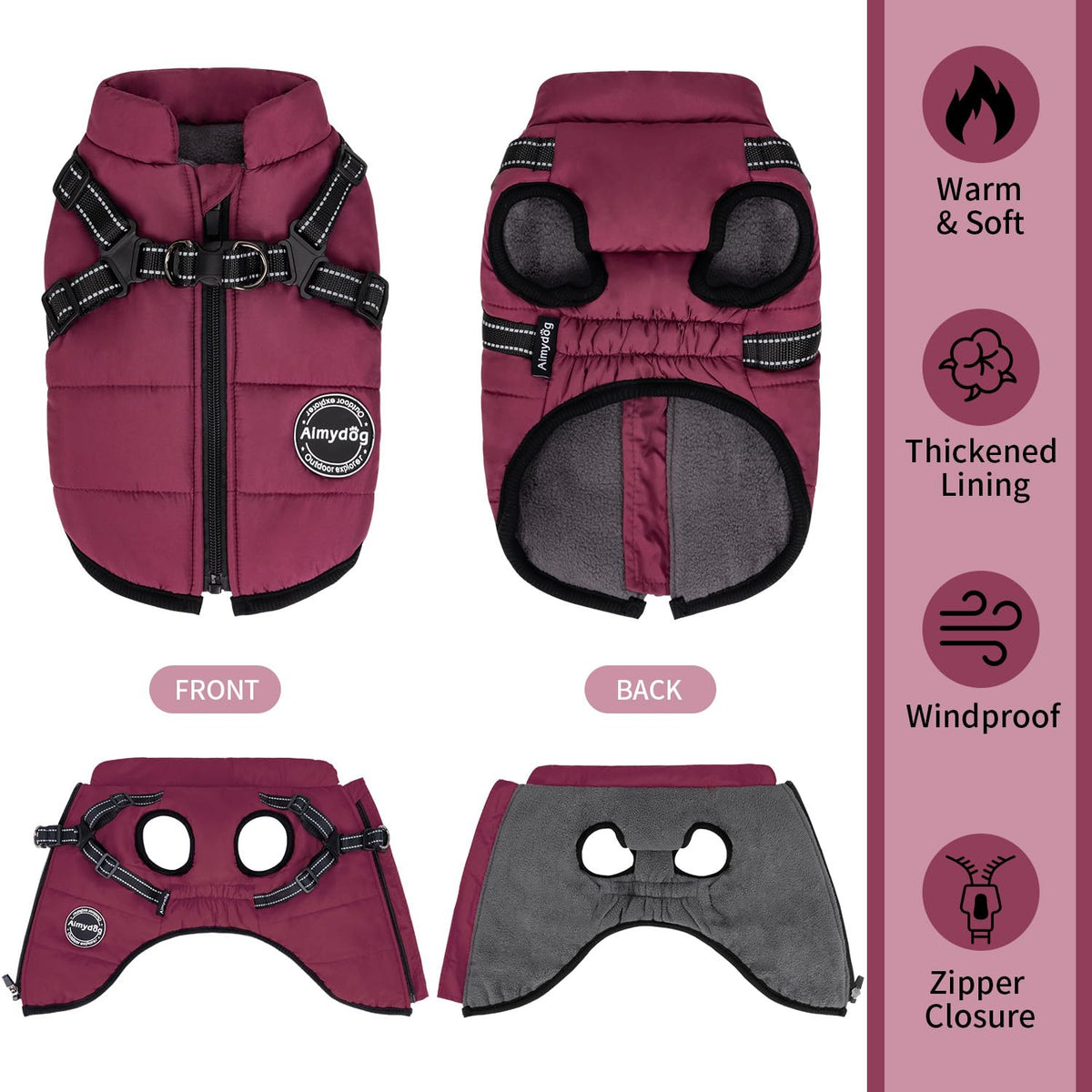 Q: Is the AIMYDOG dog coat waterproof and windproof?A: Yes, the AIMYDOG dog coat is both waterproof and windproof, effectively protecting your dog from rain and snow while keeping them warm during outdoor activities.