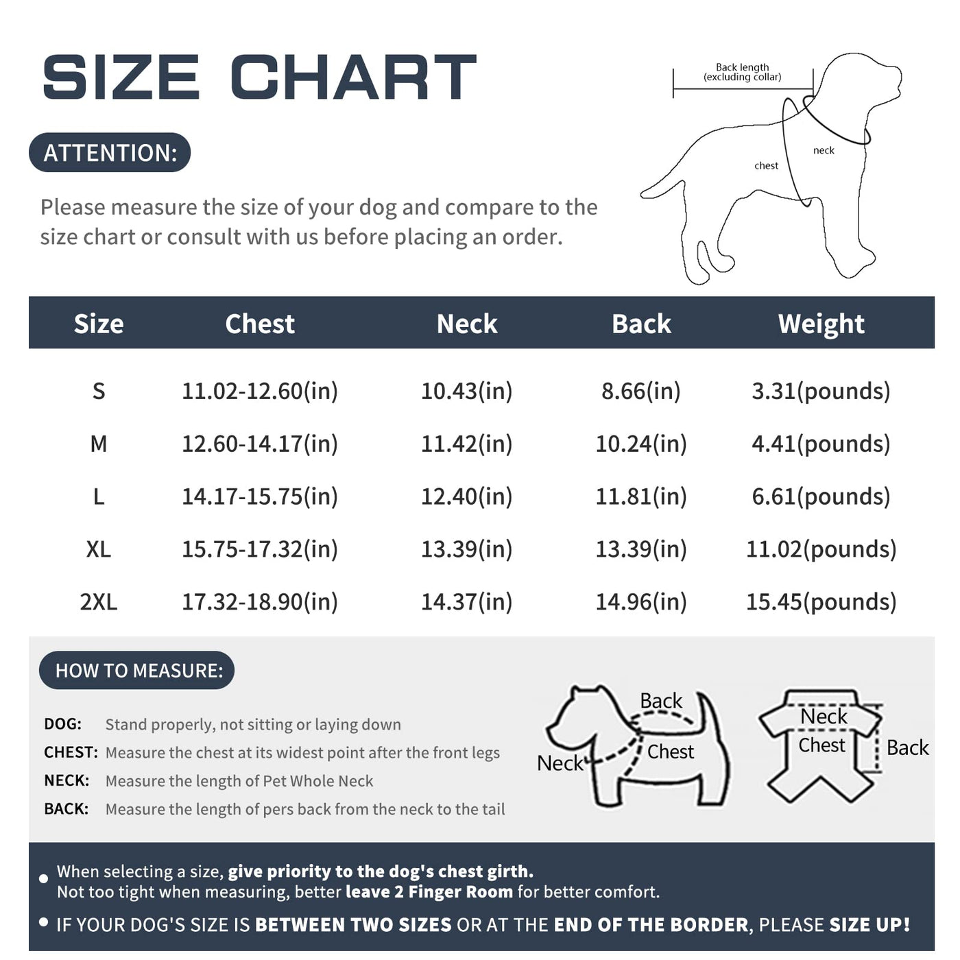 Q: What sizes are available for the AIMYDOG Warm Dog Winter Coat?A: The AIMYDOG Warm Dog Winter Coat is available in 5 sizes: S, M, L, XL, and 2XL. Please refer to the size chart before ordering, as these jackets run smaller than regular sizes.