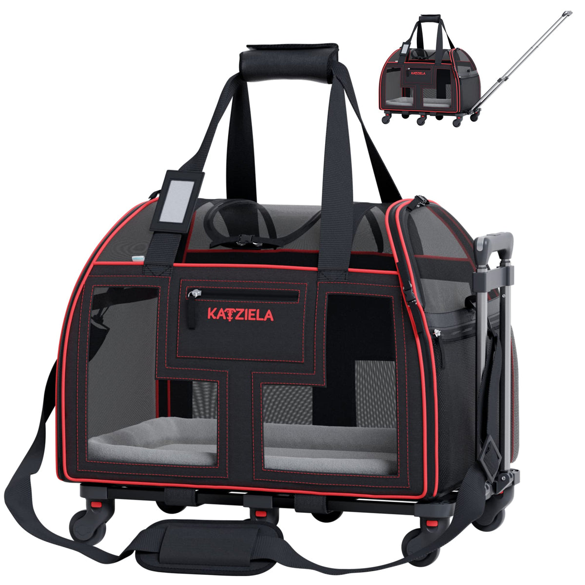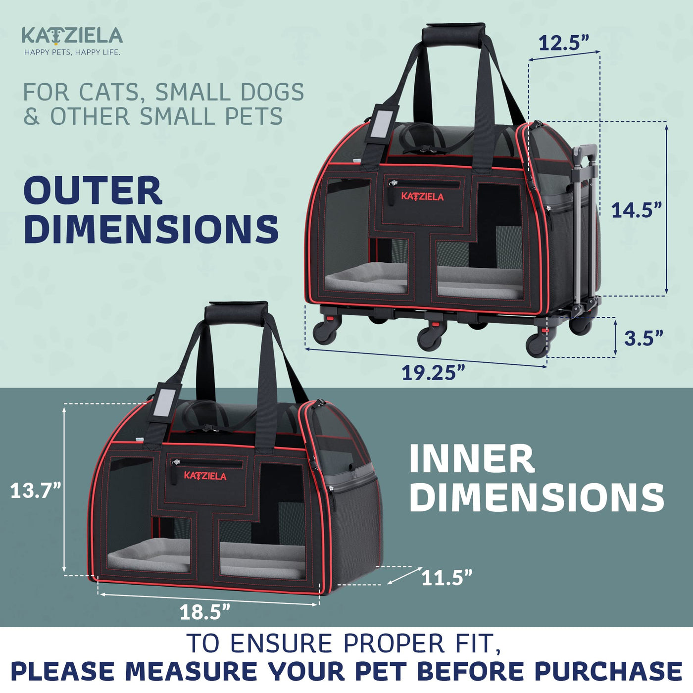 Are You Looking For The Most Comfortable, Spacious And Airline-Friendly Carrier For Your Furry Friend? At Katziela We, Like Our Wonderful Customers, Understand That Pets Are Family. Treat Cats And Dogs With The Love They Deserve And Let Them Travel In The Lap Of Luxury With The Luxury Lorry! Featuring Easy-Access, Pet-Friendly Top And Side Openings And A Well-Ventilated Mesh Design For Total Creature Comfort While Flying.Product Features:34 Telescopic Handlezipper Sides And Topl-Shaped Mesh Designimproved Ventilationouter Zipper Pocketremovable Inner Fleece Bedremovable 6-Wheel Basecolors: Black/Grey, Black/Redairline And Tsa Approvedroll Your Way To The Next Adventure In Style! With The Luxury Lorry, No Destination Is Out Of Reach For You And The Animal Friends You Share Your Life With.Travel In Comfort And Styleforget The Clunky Plastic Pet Carriers Of The Past Can You Imagine Sitting In One Of Those For A Whole Flight? Place Your Pets Priorities First And Elevate Their Travel Experience With A Cool Modern Soft-Sided Construction And Detachable 6-Wheel Base, Designed To Prevent Tip-Overs While Maneuvering Quickly Through Crowded Airports.Pet Safety And Securityyour Pets Safety And Comfort Are Our #1 Priorities. Thats Why Weve Upgraded The Luxury Lorry With Easy-Access Top And Side Zipper Panels That Lets Animals Poke Their Head Out And Enjoy Improved Freedom Of Movement. An Inner Leash Can Be Attached To Collars To Make Sure They Dont Jump Out If Excited Or Spooked.Important Note: Although The Carrier Might Slightly Exceed The Exact Dimensions Specified By Certain Airlines, The Airlines Clearly State That For A Soft Top Carrier Which Folds In Slightly - The Luxury Lorry Is Allowed, And Can Be Brought Onto Your Flight.Please Be Sure To Independently Verify This With Your Airline Before Booking.