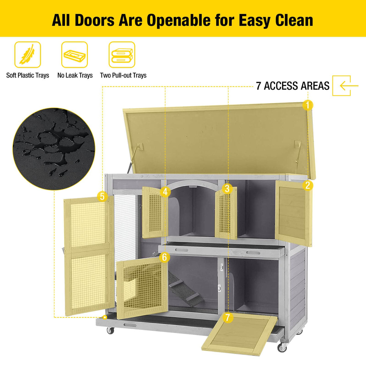 Q: How easy is it to clean the Aivituvin Bunny Cage?A: Cleaning is straightforward with the Aivituvin Bunny Cage, thanks to its two deep pull-out trays that can be easily removed for hassle-free maintenance. Additionally, multiple doors allow for convenient access during cleaning.