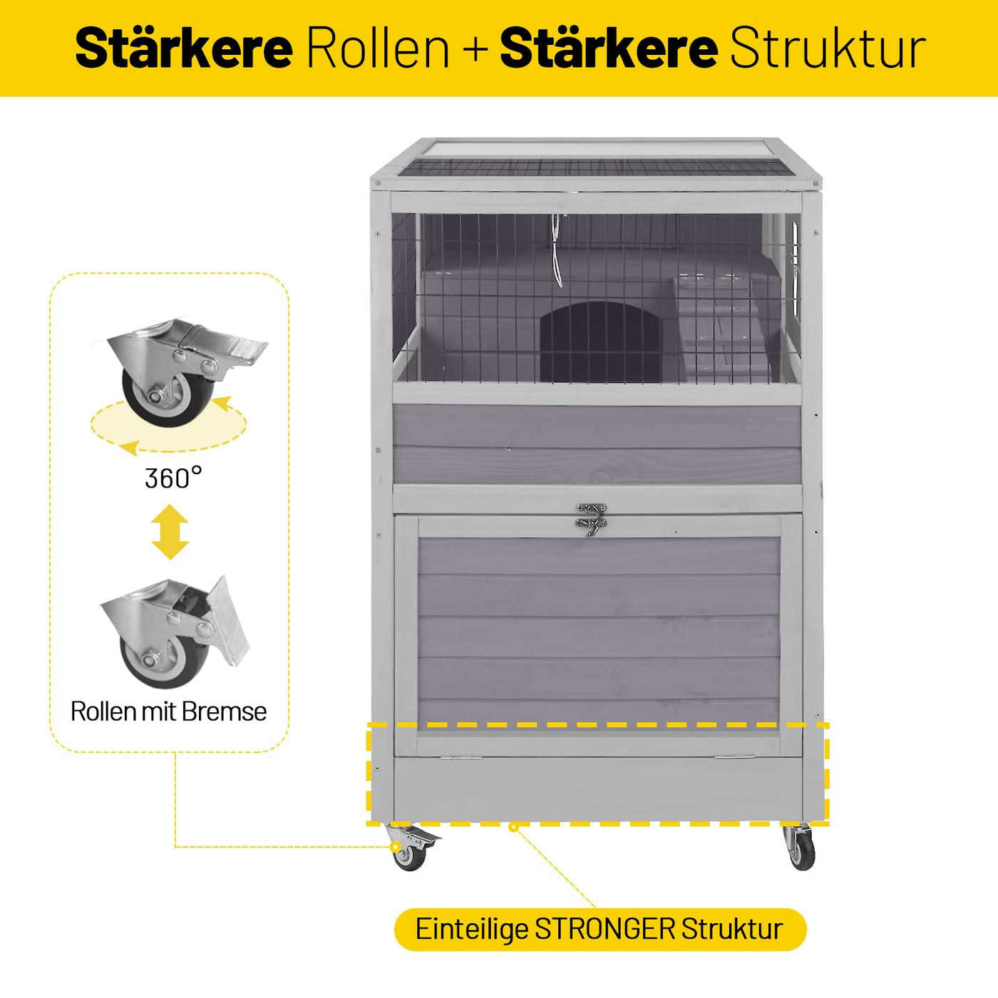 UPgRADE VERSION: Bunny cage with 2 DEEPER removable pull out tray NOT LEAK Better plastic quality easy to clean UPgRADE VERSION: Bunny hutch with removable bottom wire-netting above the tray to separate the urine & poop also will avoid the pets escape when the tray pull outSolid Fir Wood 100% Natural NON TOXIc to animals UPgRADE VERSION: Rabbit house on 4 wheels easily to move 2 of them are locking wheel to fix well and safe UPgRADE VERSION:guinea pig cage combine with UV proof roof & wire roof protect the rabbit bunny from UV & rainy and enjoy sunlight large left side doors 4 front door for every direction easy catch UPgRADE VERSION: Large rat cage Double-floor connect with ramp trap door to separate upstairs from downstairs spacious and separated space for 2-3 Bunnies and other small pets