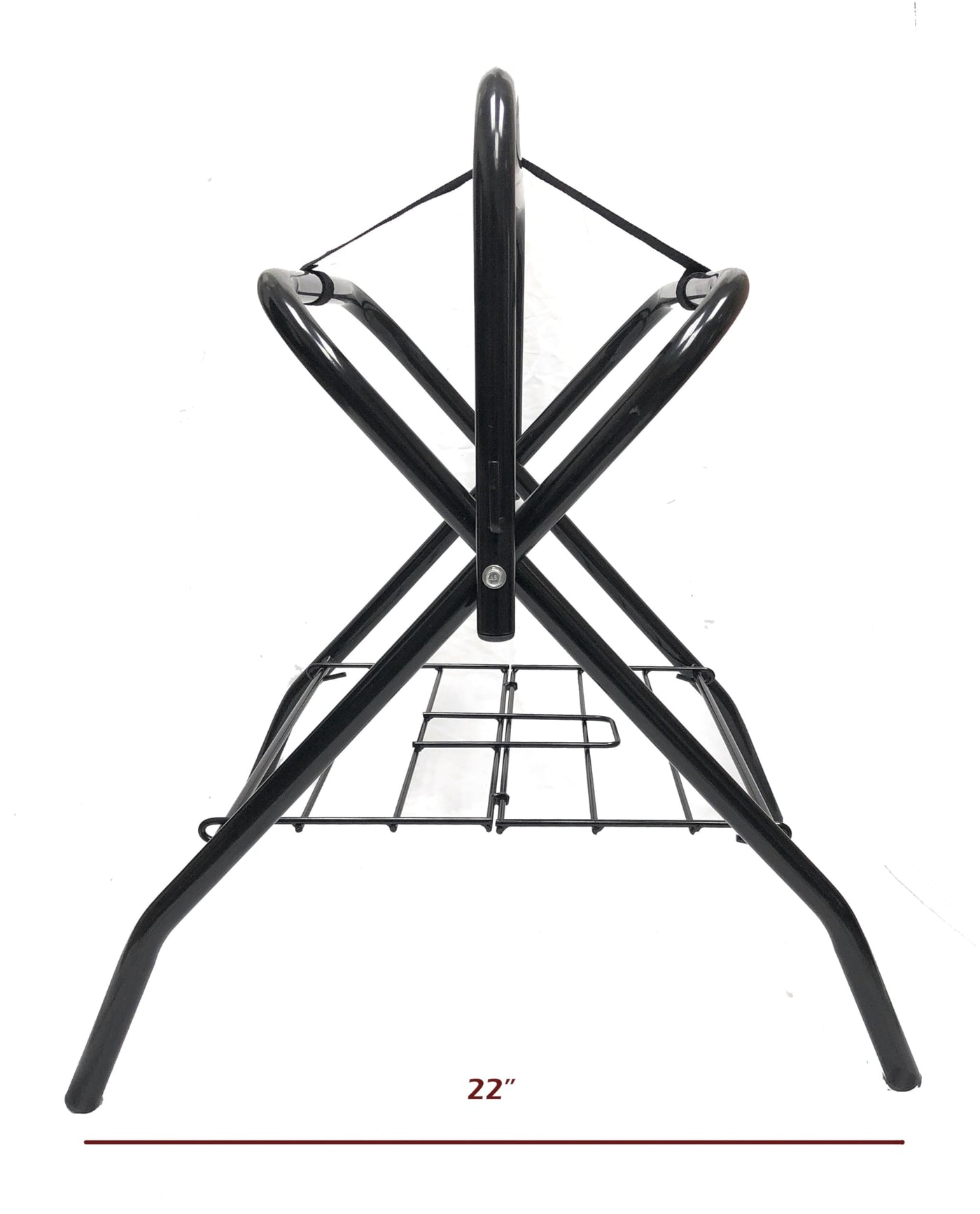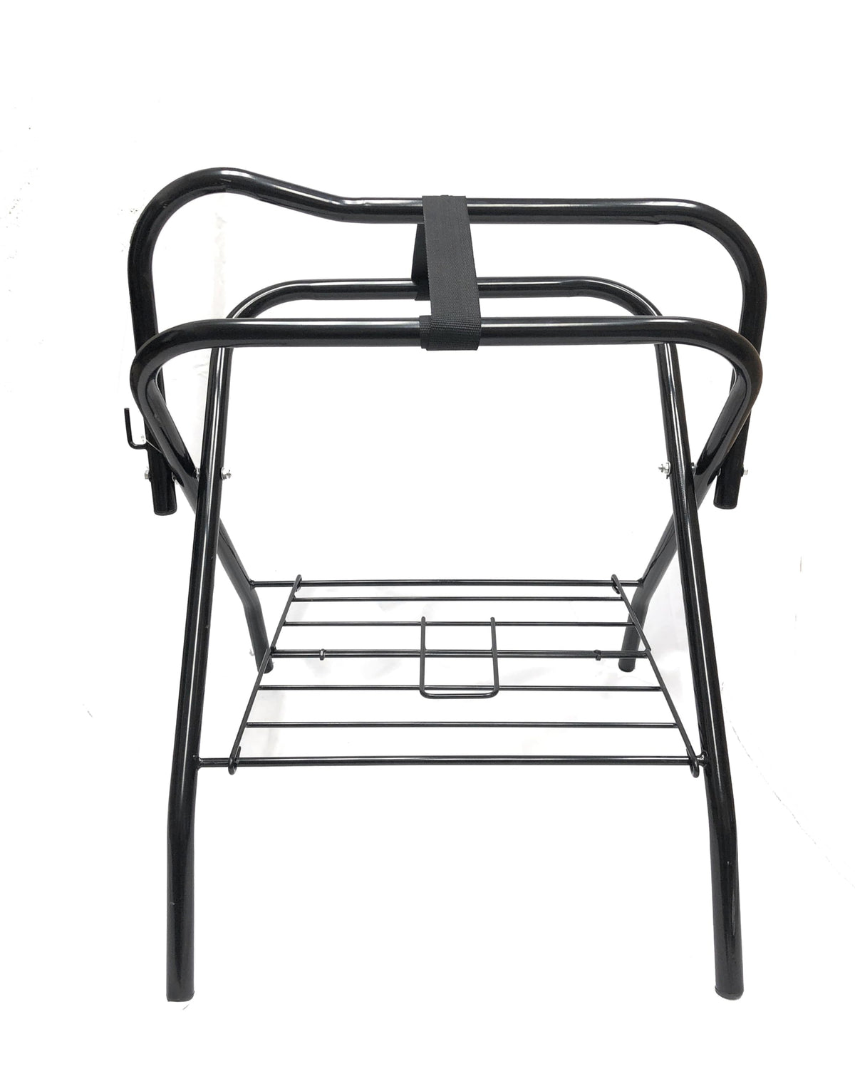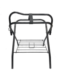 The AJ Tack Freestanding Mini/Pony Portable Saddle Rack is a compact and sturdy solution for storing smaller saddles at home, in the barn, or on the go. Made from durable powder-coated tubular steel, it resists rust and wear for long-lasting use. Designed for convenience, this rack features improved double straps for added stability, ensuring your mini or pony saddle stays securely in place. Its lightweight, foldable design allows for easy transport and storage, while rubber feet protect floors from scratches. Best of all, it requires no assembly--just unfold and it's ready to use. Key Features: Powder-Coated Tubular Steel: Provides a durable, rust-resistant frame built to withstand daily use. No Assembly Required: Simply unfold and start using it right away. Improved Stability: Double straps offer extra support to keep your mini or pony saddle secure. Folding Sides: Easily collapses for compact storage and effortless transport. Rubber Feet: Helps prevent floor damage, making it safe for use in barns, trailers, and tack rooms.