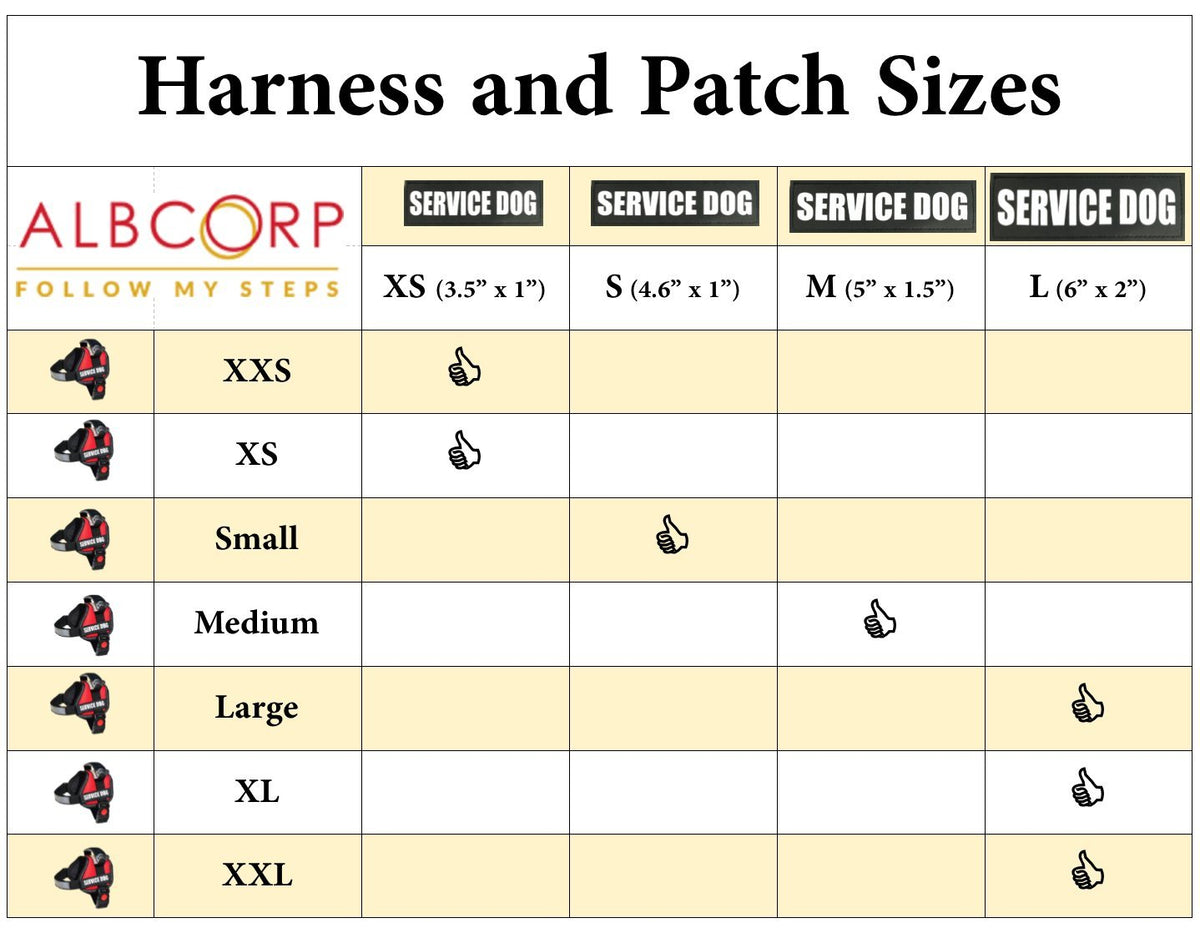 Q: What sizes do the Albcorp Do Not Pet patches come in?A: The Albcorp Do Not Pet patches are designed for a range of animal vest sizes, specifically suitable for XXS to XXL. The patch size is Medium, measuring 5 inches by 1.5 inches.