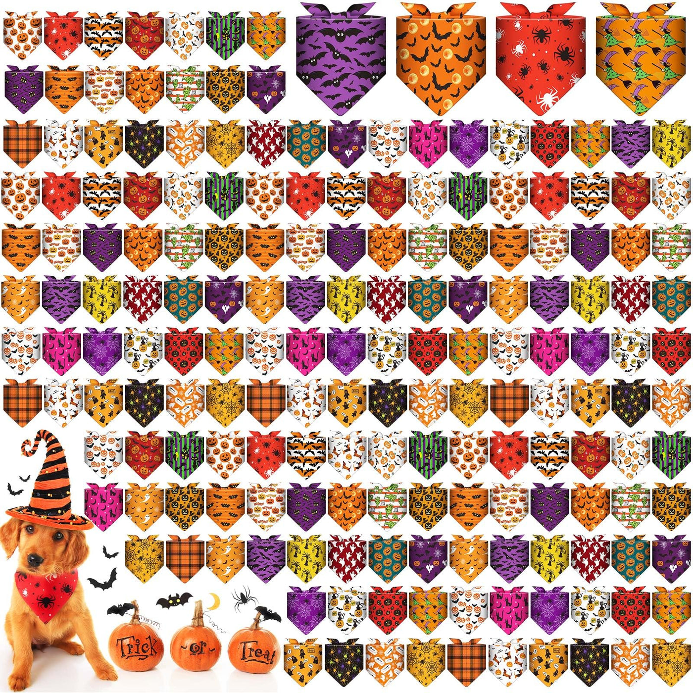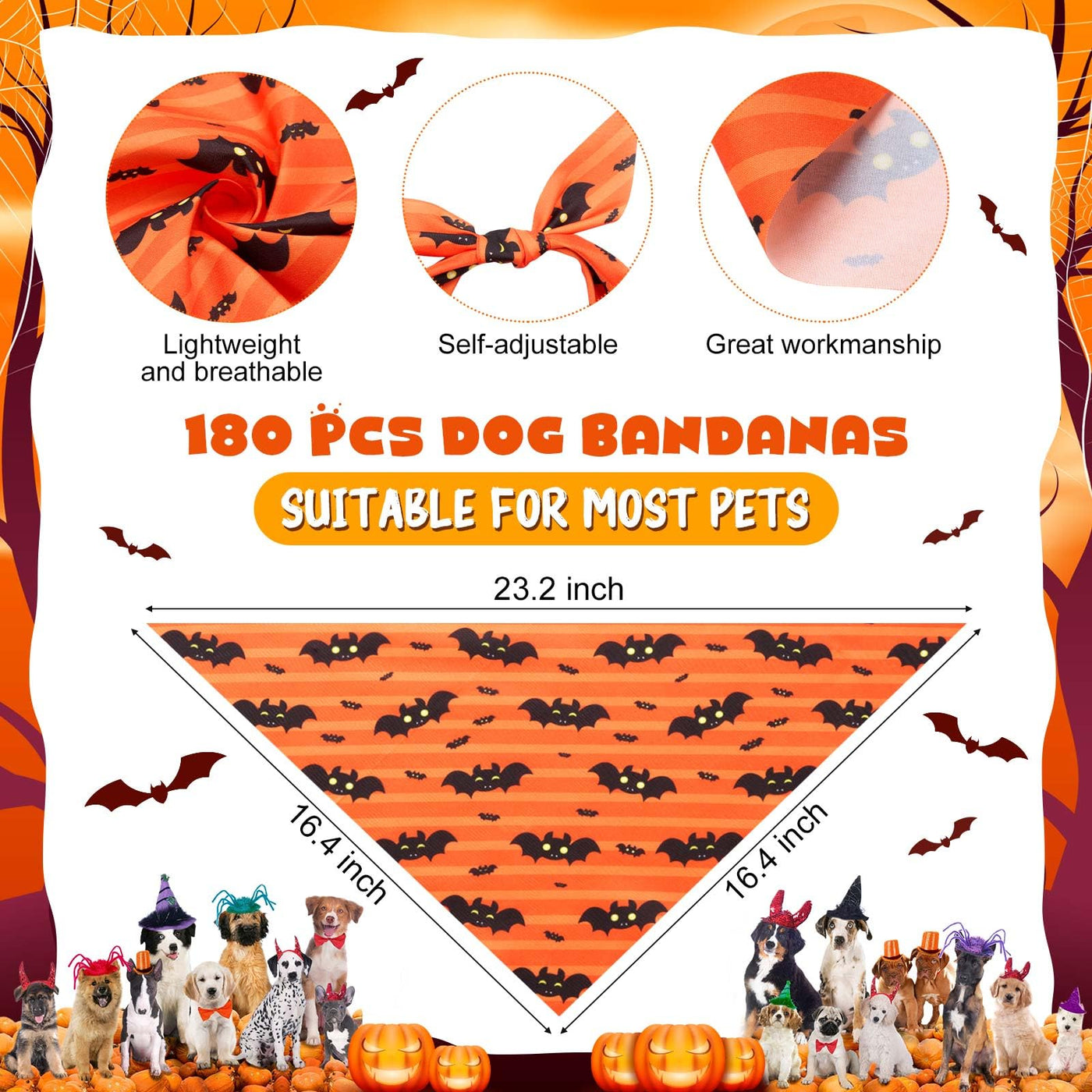 Features: Easy to clean and fold: These triangle dog neckerchief can be folded multiple times for easy storage and portability. It can be hand washed or machine washed, and it is also very convenient for daily replacement and cleaning. Multiple ways to wear: You can tie our adjustable dog bandana around your pets neck or head, or even on your pets back. Specifications: Material: polyester Dimensions: approx. 23.2 x 16.4 x 16.4 inches (58 x 41 x 41 cm) Color: as shown in the pictures Package includes: 180 x Halloween dog bandanas bulk Notes: Due to manual measurement, there may be slight errors in size. Due to different screen displays, there may be slight differences in color. Please measure your pets size before ordering. And observe the pets reaction when using. Please remove the product in time if there is any discomfort.