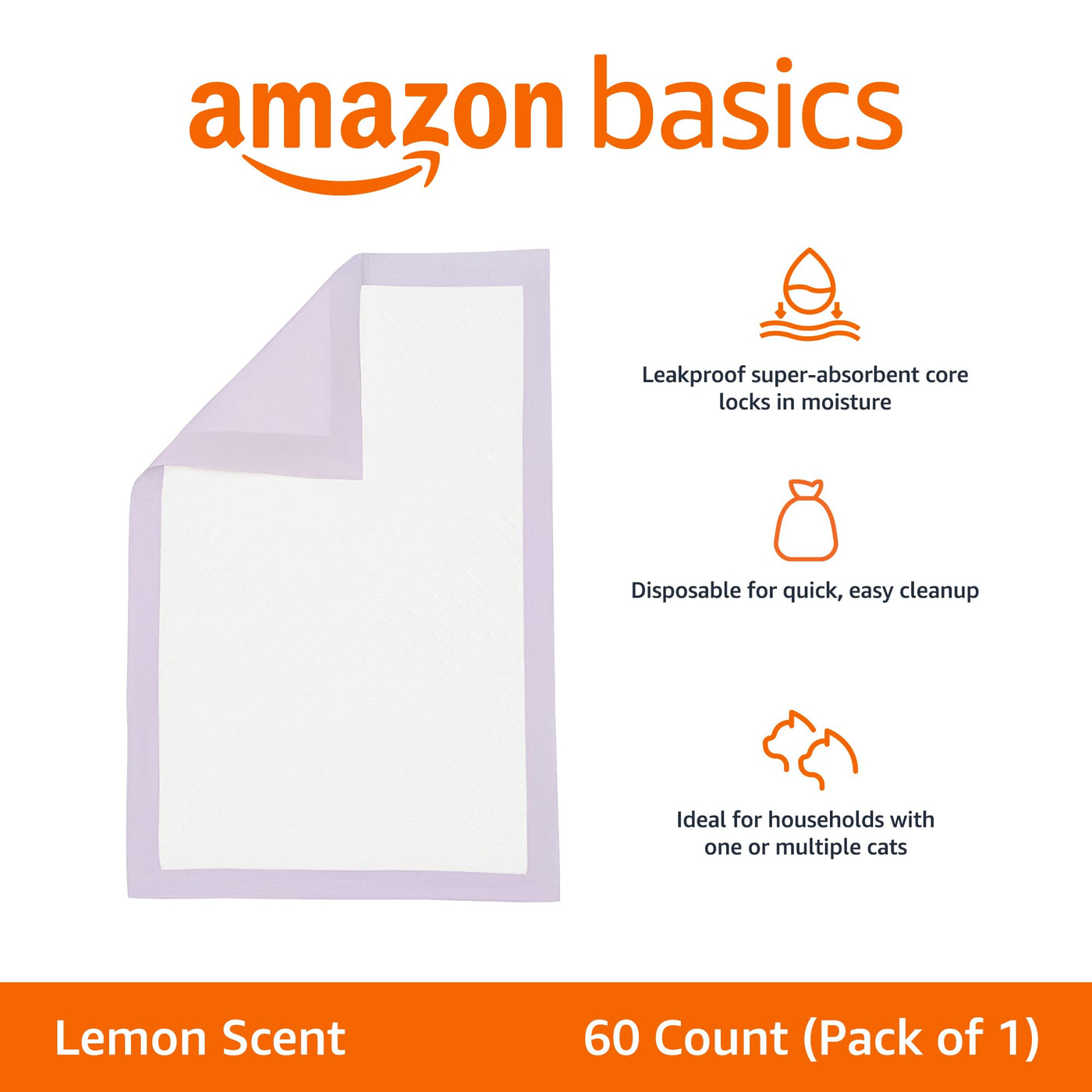 Amazon Basics Cat Pee Pads, 60 Count, Universal Fit For Litter Box, Odor Control With Lemon Scent, White/Purple