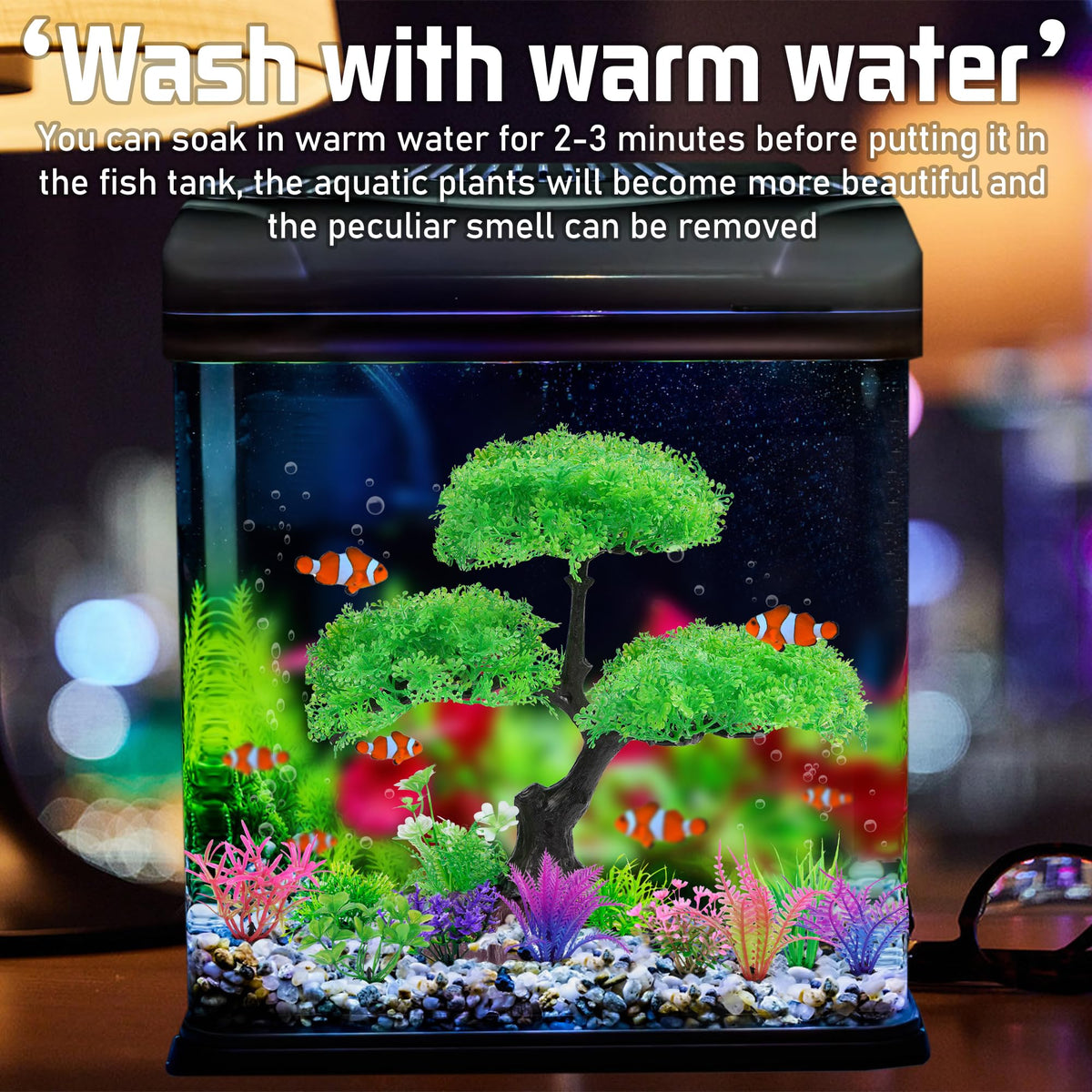 Q: How do I care for and maintain these artificial aquarium plants?A: These artificial aquarium plants require minimal maintenance. They do not need pruning or specialized lighting, and they won't affect the water pH. Simply rinse them with warm water before placing them in the tank, and they will retain their vibrant color without fading.