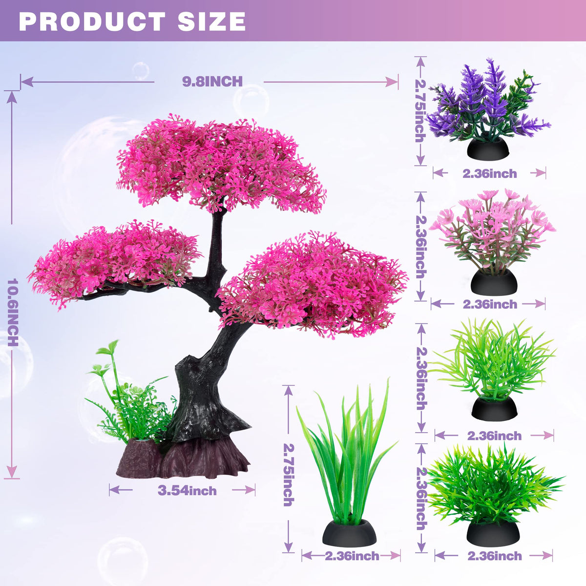 Ameliade Aquarium Artificial Plastic Plants Decoration, Pink Cherry Blossom Tree & Grass Aquarium Decor Set, Goldfish Betta Fish Tank Decorations Hides Accessories(Pink