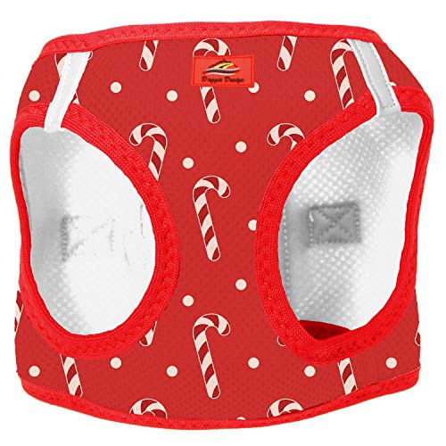 The famous features you love in a choke-free safety harness are now available in a festive winter print! This limited edition Candy Canes American River Choke-Free Dog Harness by Doggie Design is perfect for the holiday season and features candy canes and polka dots scattered over a red background. The American River Ultra Choke-Free Mesh Dog Harness protects pets' vulnerable airways by distributing all pulling pressure over the chest - not the neck. This is particularly important for teacup and small dog breeds prone to damaging their tracheas. Though gentle on your pet, strength is not sacrificed. The double safety closure has touch fastener and a high-strength plastic side release buckle. This harness also includes a Double D-Ring leash attachment for an additional level of strength and safety when used with a leash. Simple and easy to use! Have your pet step in the leg holes, wrap the fabric up and around the back, smooth the touch fastener and clip the buckle. When using with a leash, clip through both D-rings. Do you have a hard-to-fit dog or cat? This harness can be customized with wide touch fastener fabric that can be swiveled at an angle to adjust to most any pet. Experiment with the angle of the hook and loop fabric to find the best fit to prevent any gaps in the fabric. This will keep your pet safe and comfortable. The mesh fabric is sturdy, soft, and breathable, making it ideal for most any climate. Reflective strips are included for better visibility in low-light conditions. This Ultra Choke Free Harness is the perfect design for use as a dog seat belt harness to keep your pet from interfering with your driving. The choke-free design will provide your pup extra safety in the event of an accident. Made of 100% soft mesh polyester. Machine wash and line dry. Certified Break Strength Tested to 386 Lbs, by an International Independent Testing Laboratory.