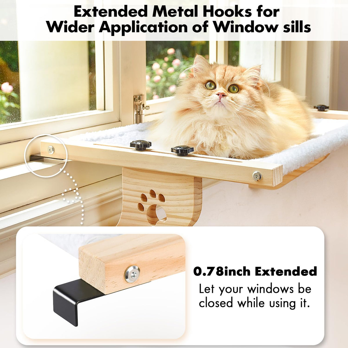 Amosijoy Cat Sill Window Perch Sturdy Cat Hammock Window Seat With Wood & Metal Frame For Large Cats, Easy To Adjust Cat Bed For Windowsill, Bedside, Drawer And Cabinet (24.4''-White Plush)