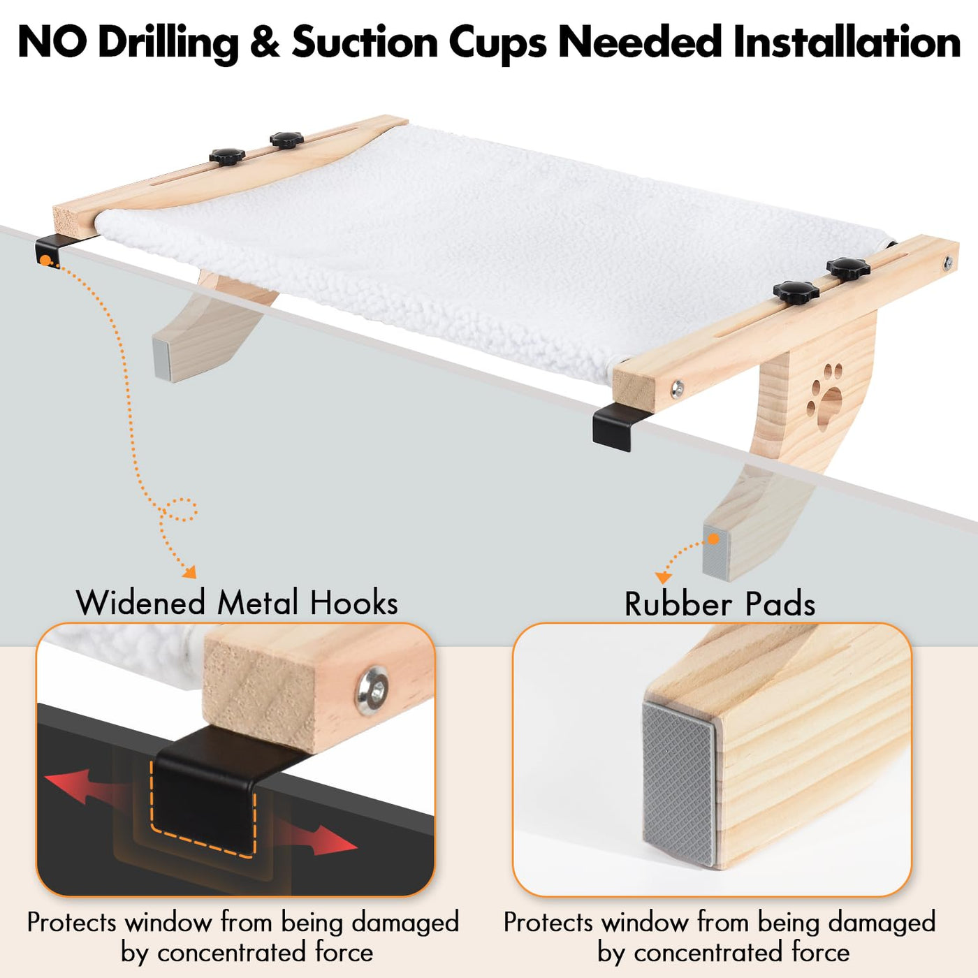 ARgE SPAcE cAT WINDOW PERcHThe size of the large cat sill window perch is 244AAx15AAx69AA ideal for large cat The main frame of this cat bed is made of thickened wood and hard metal It is of great safety that it can holds up to 40lbs firmly on the window SIMPLE ASSEMBLLY & ADJUSTMENTThe assembly of this cat window hammock is easy that only a few steps are taken to set it up After the assembly is complete you just need to screw the thumb screws to adjust the distance between hooks and supports to fit the thickness of your window sill Avoid the hassle of twisting the screws with a wrench for each time O DRILLINg & SUcTION cUPS NEEDED FOR INSTALLATIONThis cat bed is fixed on the carrier by two metal hook and supported by two wooden supports without the need to damage the wall and the worry of the suction cups falling off The metal hooks are widened The contact surface with the windowsill is larger that protects your window from being damaged by the concentrated force TWO DIFFERENT FABRIcS REVERSIBLE cOVERThe cover of this cat window perch is reversible with two kinds of fabrics One is berber fleece and the other is suede Both of them are soft and skin-friendly without chemical smell Let your cats feel warmer and more comfortable while lying in this resting seat The plush cover is removable for wash WIDE-RANgE USEAMOSIJOY cat bed is design for using on window sills cats can enjoy sunbathing and watching outside on it It can also be placed on the bedsides allowing you and your cat to accompany each other and keeping cat hair from getting all over the bed Drawers cabinets would also be the applicable places