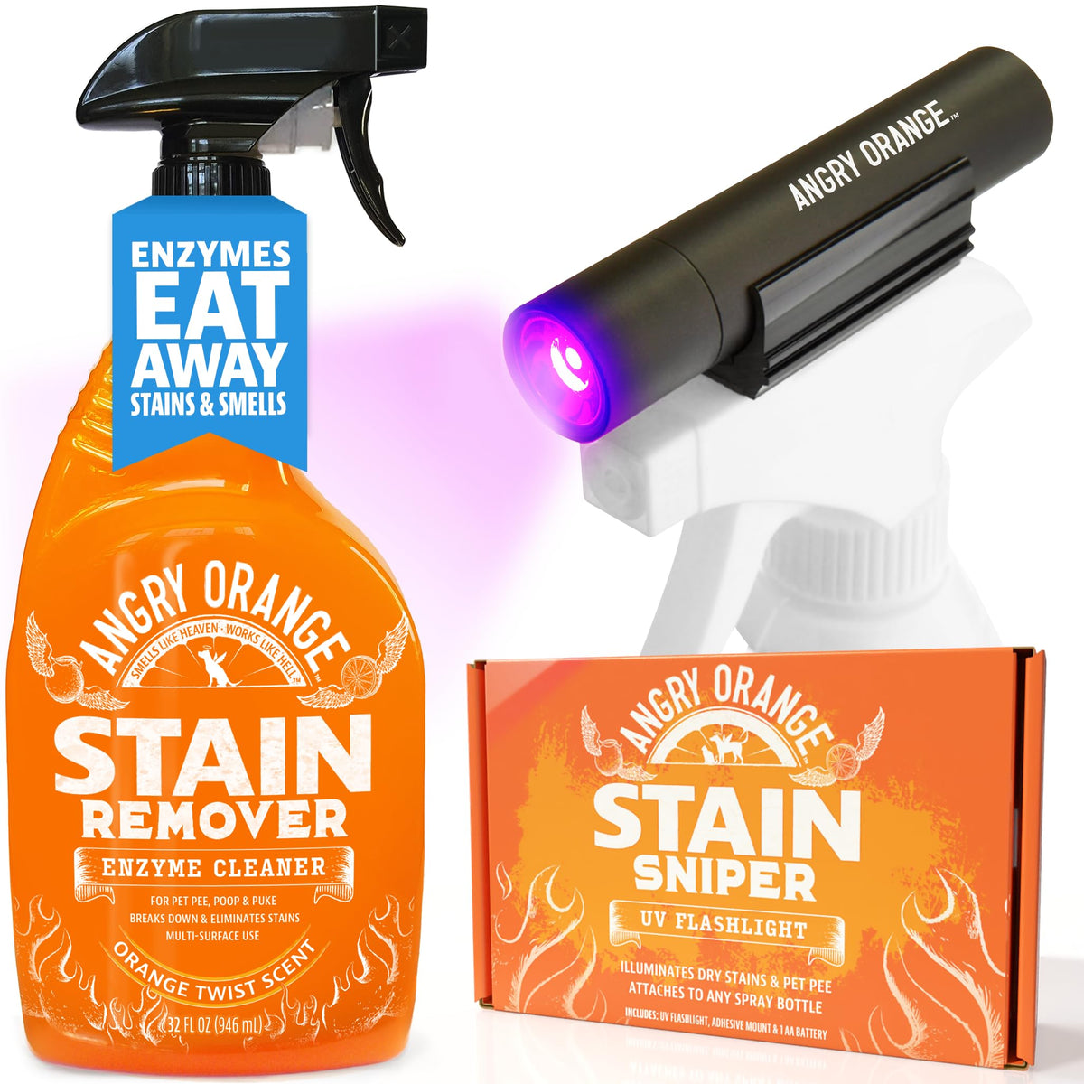 This Kit Includes A Uv Flashlight And Enzyme Cleaner Spray Will Help You Removing Stains And Pee Odors From Carpets. Uv Light Can Find Stains Nearly Invisible For Naked Eye Just Spray Angry Orange Enzyme Cleaner And Let The Formula Clean And Deodorize. Reformulated In 2019. Now Stronger And More Effective! The Enzyme Cleaners In Angry Orange Convert Pet Stains And Other Organic Matter Into Co2 And H2O! Enzyme-Based Cleaners Also Perform Residual Cleaning. They Will Continue Cleaning Well After The Product Has Been Applied. This Improved Product Performance Contributes To Improved Productivity. The Enzymes Can Keep Working For Up To 80 Hours After Application Ensuring That Soils And Malodors Are Fully Removed. Angry Orange Has A Fresh Citrus Scent But Does Not Smell Well ''Super Orange-E'' Like Our Famous Original Pet Deodorizer. For A Great 1-2 Punch Feel Free To Combine Our Amazing Products For A Truly Super-Powered Cleaning Experience! These Are Must Own Pet Supplies If You Want You Home To Feel Fresh And Clean! Caution: Keep Out Of Reach Of Children. Not For Human Or Animal Consumption. Use Only As Directed. Discontinue Use If Irritation Develops. Avoid Eye Contact. In Case Of Eye Contact Rinse Immediately With Warm Water. Wash Hands After Use. If Swallowed Seek Medical Advice.