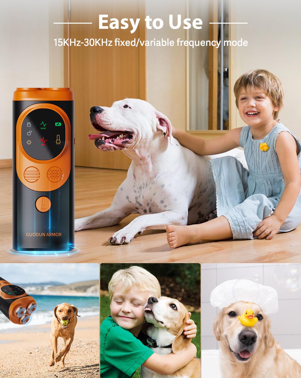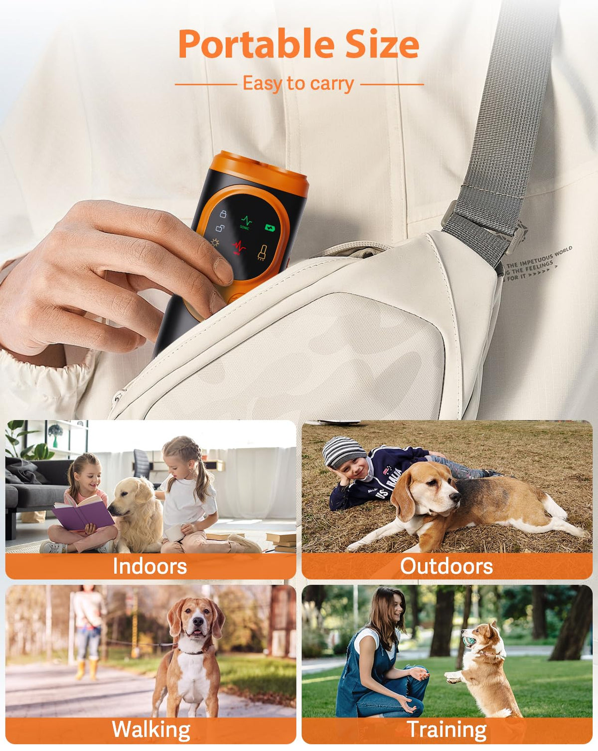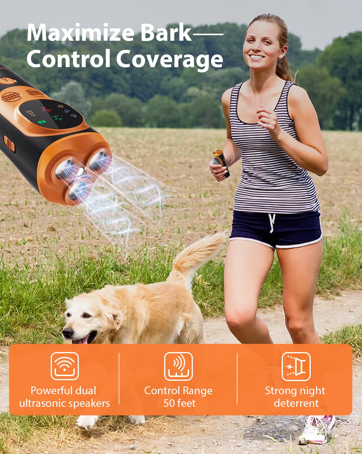 1. Three - Minute Behavior Corrector Our Dog Bark Deterrent Devices Taps Into Dogs' Natural Senses To Break The Barking Reflex. Swiftly And Safely, It Halts Common Nuisances Like Barking, Chewing, And Chasing. In Just Three Minutes, Transform Your Feisty Pup Into A Well - Behaved One. Ideal For Those Rushed Moments, Such As When Guests Arrive And Your Dog Won'T Quiet Down. 2. Ultra - Long Distance Control With A 50 - Foot Control Range, This Barking Deterrent Device Works From Afar. Whether You'Re On A Stroll, Commuting Home, Or Out For An Adventure, It Fends Off Aggressive Dogs, Safeguarding You, Your Companions, And Especially Children And The Elderly. Picture An Elderly Person Walking Their Dog In The Neighborhood, Feeling Secure Even With Other Dogs Around. 3. Large Capacity And Fast Charging Battery Featuring An 800Mah High - Density Lithium - Ion Battery, Our Barking Silencer Charges In 90 Minutes And Lasts For 40 Days. It Keeps Your Space Peaceful And Corrects Your Dog'S Bad Habits Over Time. No Need To Worry About Power During Long Home - Stay Training Sessions. 4. Three Intensity Modes Of Dog Anti - Barking Device Using High - Frequency Ultrasound And Rapid Light Strobing, This Anti - Barking Device Has A 20 - 30Khz Jump - Wave Mode And A 25Khz Deterrent Mode. The Deterrent Mode Activates High - Speed Strobing Lights, Letting You React Fast To Surprises. Paired With Daily Commands, It Tames Dogs More Effectively And Safely. If Your Dog Suddenly Becomes Aggressive During A Hike, You Can Immediately Switch To The Appropriate Mode To Handle The Situation. 5. Practical Led Lighting The Ultrasonic Dog Repeller Has A Bright Led At Its Base. It Lights The Way During Night Walks And Helps Find Lost Pets. In Deterrent Mode, It Also Keeps Stray Dogs At Bay. In A Dark Alley At Night, It Not Only Illuminates But Also Protects You And Your Dog. 6. Lightweight, Portable And Practical Weighing Just 0.33 Pounds (150 Grams), This Device Has An Ergonomic Design For A Comfortable Hold. It Has A One - Touch Lock To Prevent Accidental Presses And A Clear Display For Mode And Battery Info. Whether Jogging With Your Dog Or Traveling, It'S Easy To Carry, Adding No Extra Load. Overall, Our Dog Behavior Control Device Is Essential For Every Dog Owner. Packed With Features, It Solves Dog Behavior Issues, Making Your Life With Your Pet More Harmonious And Enjoyable.