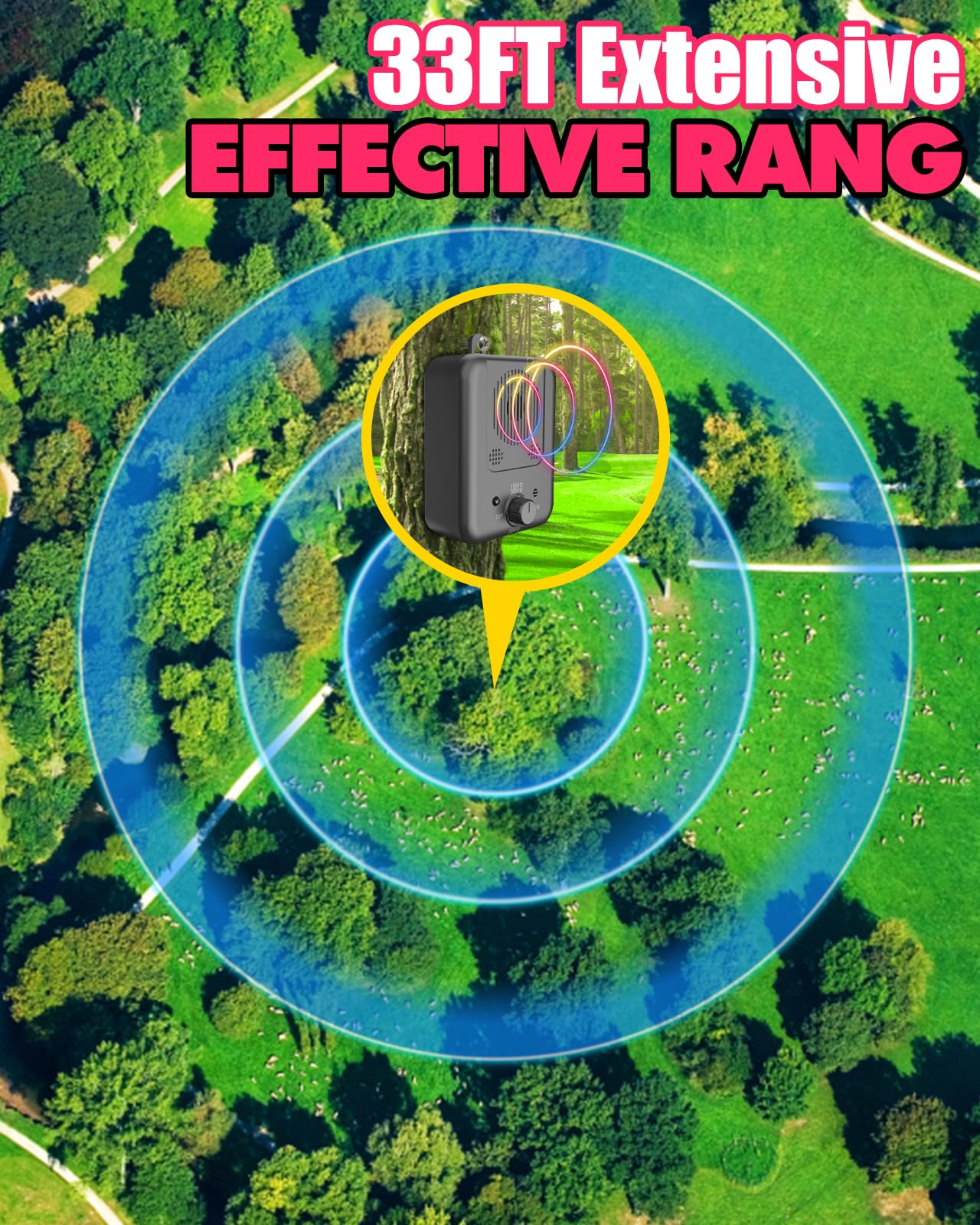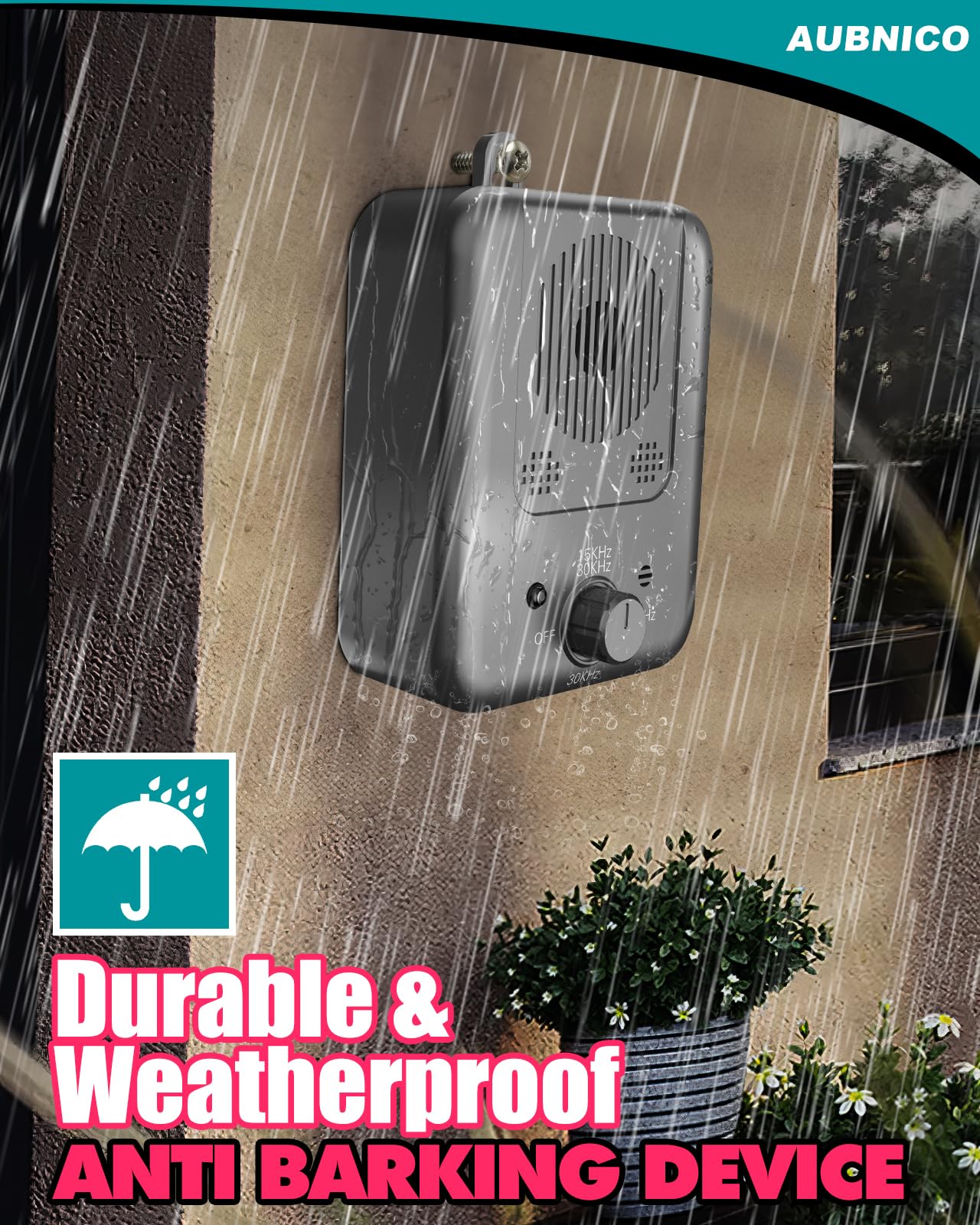 Anti Barking Device Features1. Safe and effective for dogs of all sizes: Anti barking device equipment is safe and effective for dogs of all types and sizes (6-125 pounds).2. Wide effective range: 33-feet control range, Dog Barking Control Devices are great for deterring neighbor dogs or homeless dogs from barking near your house.3. Dog Barking Control Devices only need to be fully charged for 2 hours to standby time: 1 month4. Dog Barking Control Devices 4 different frequency waves to avoid dogs getting used to simple frequencies. Usage of the Anti Barking Device(1) Choose the mode you need by rotarying the switch(2)The device will emit 1-3 levels of ultrasonic waves in sequence. If there is no sound after turn on, check that the product is fully charged.(3) The Anti Barking Device has a mounting hole on the back. You can make a small hole in the fence or a tree (refer to the size of the screw and expansion screw), put the expansion screw in the drilled hole, and then screw the screw into the expansion screw. Then the expansion screw will expand and get stuck in the hole. Hang up the anti barking device and it'll be stable. SpecificationsSize: 3.15*1.57*4.65inWeight: 5.29OZMaterial: ABS Waterproof function: IPX4Battery: 1500mAh rechargeable Lithium_Ion battery 3.7V Ultrasonic frequency: 13KHZ-36KHZ Attention(1)If the dog is deaf or hearing impaired, it may not react to the Bark Control. (2)If you have used other anti barking device on your dog, it may have been adapted to ultrasound, it may not react to anti barking device.(3) The unit is designed with provisions for hanging and should be positioned at a height of no more than 10ft(3M).(4) Anti Barking Device occasionally change the position, high sensitivity, and frequency to prevent the dog from adapting; It is best not to have a large barrier between the Anti Barking Device and the dog.(5) Some dogs have a two-week adaptation period, please wait patiently for two weeks to observe the dog's reaction, thank you.(6) Anti Barking Device can be used for about 15 days with full charge. Please charge it in time without power. Do not use it while charging! What's in the box?Anti Barking Device*1Mounting Screws*2 Anchors*2